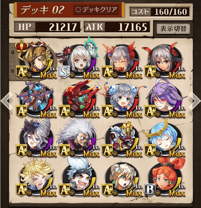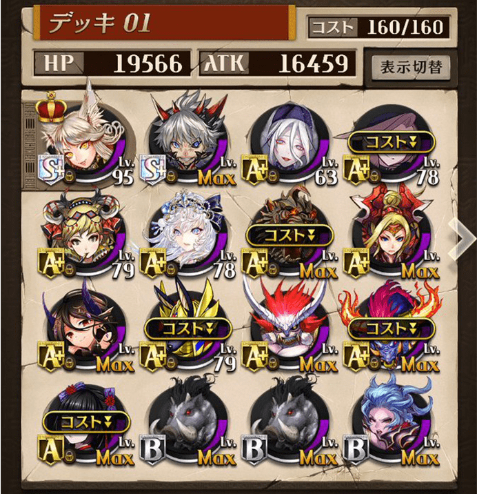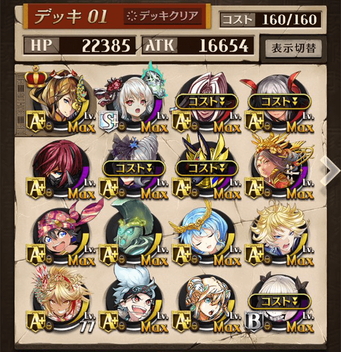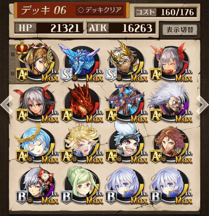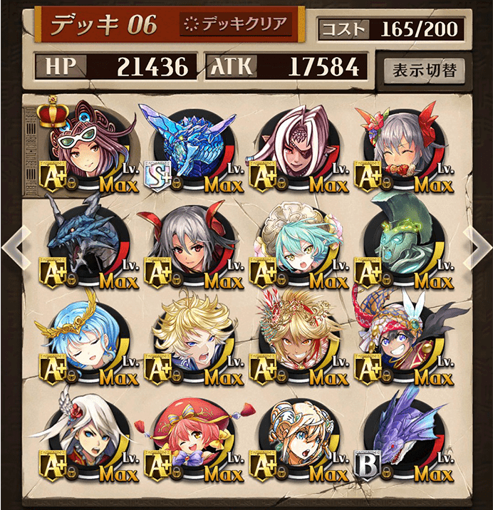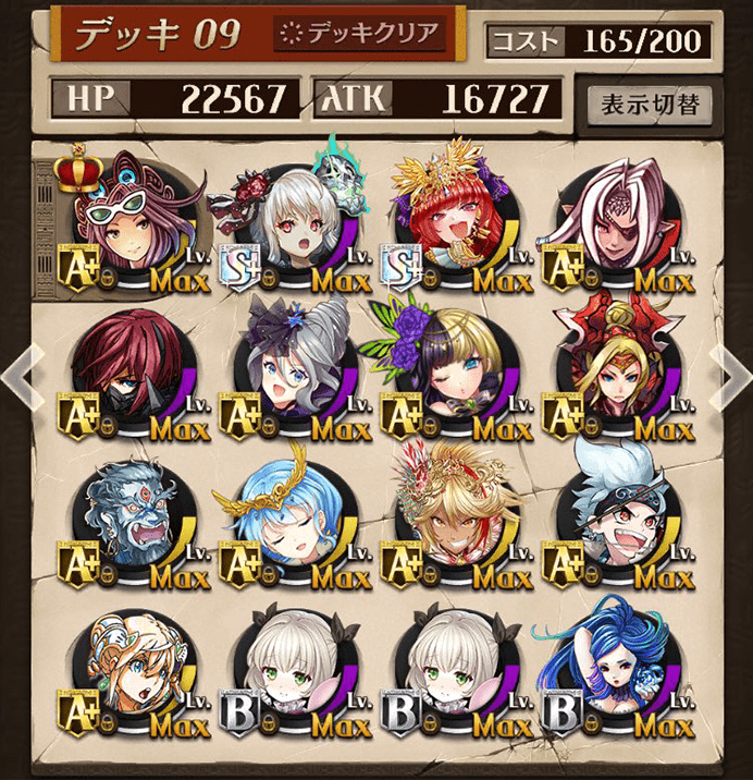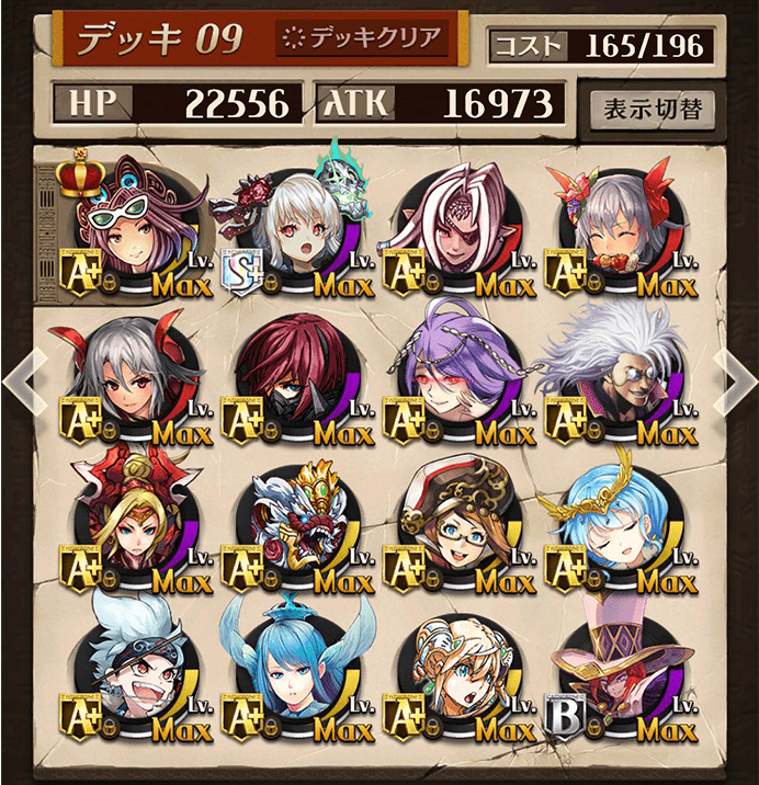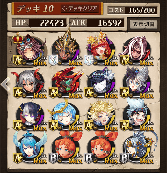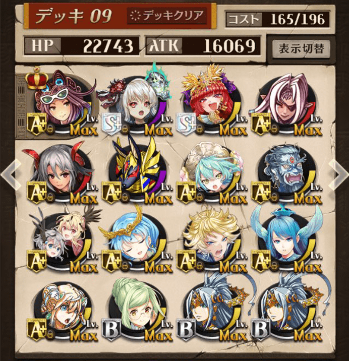 「超駒いないから、決戦キャラで頑張ってるデッキ!」できるだけ火力を高く竜と特殊1.◯倍キャラを多めに入れました。MT杯ではアヌビスにコンボ消されるたびに絶望してました。