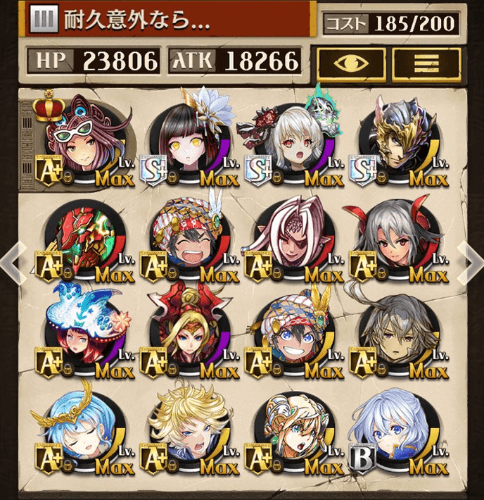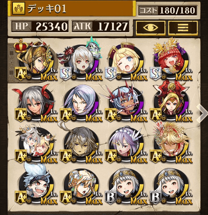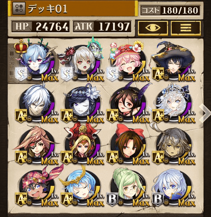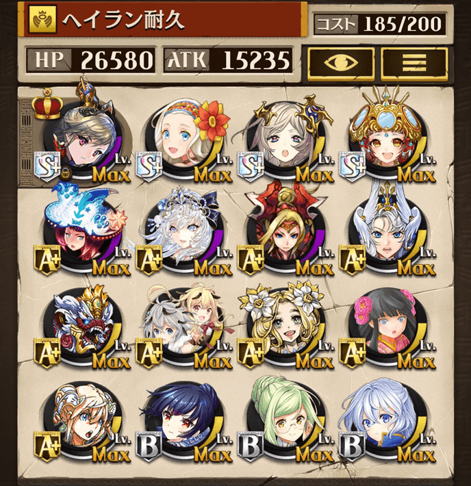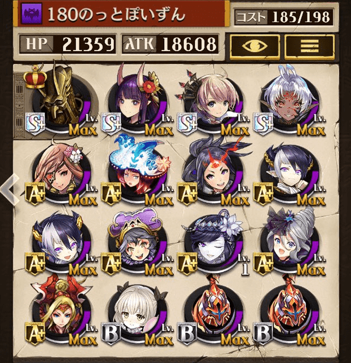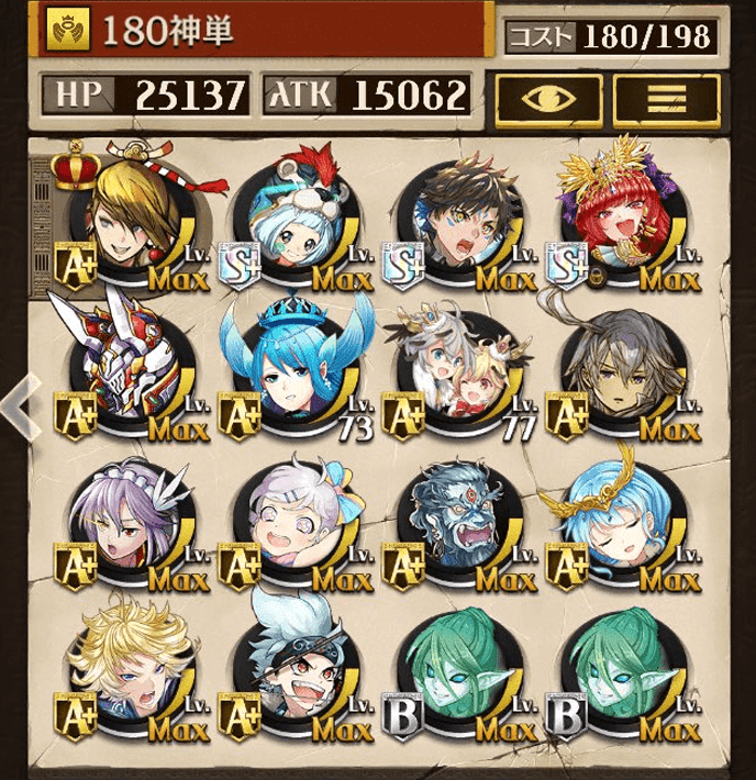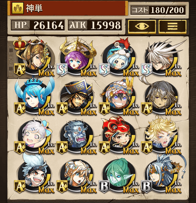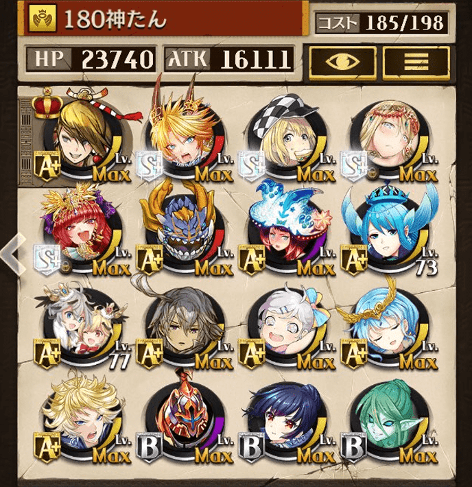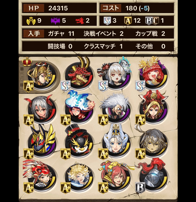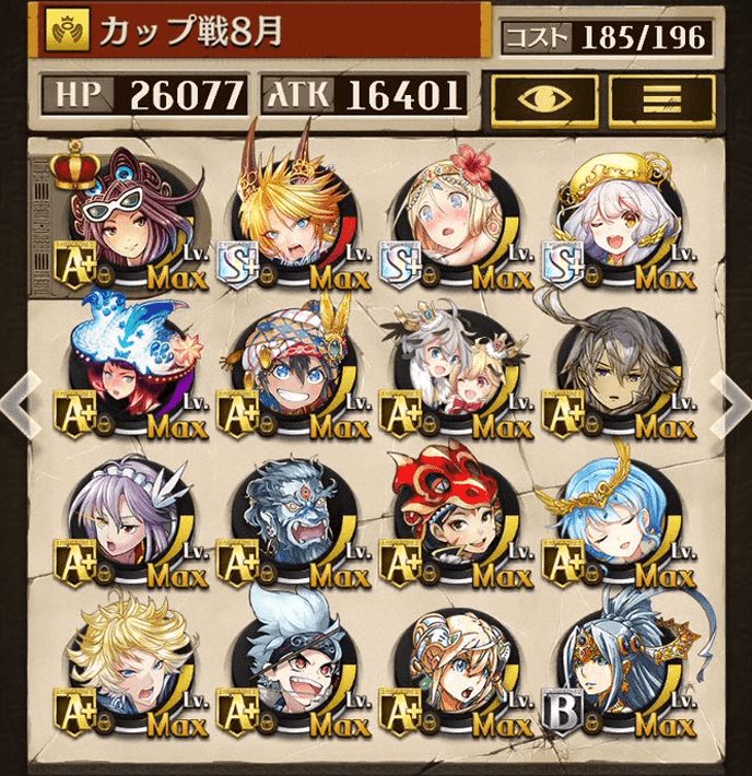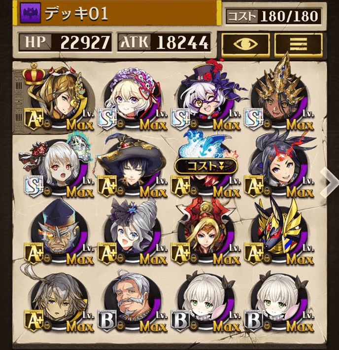 魔を中心に好きな駒を入れました。毒デッキには弱かったですが、他はどんなデッキが来ても安定。蘭陵王リーダーが多かったので、アルンが大活躍でした♫ スキルの発動条件が少ない駒ばかりだったのも、良かったところだと思います😊