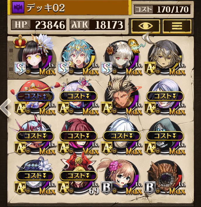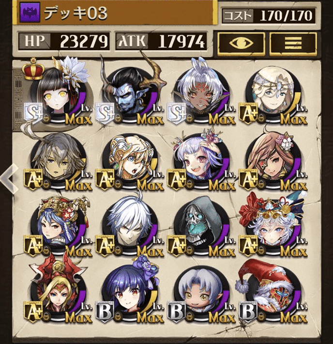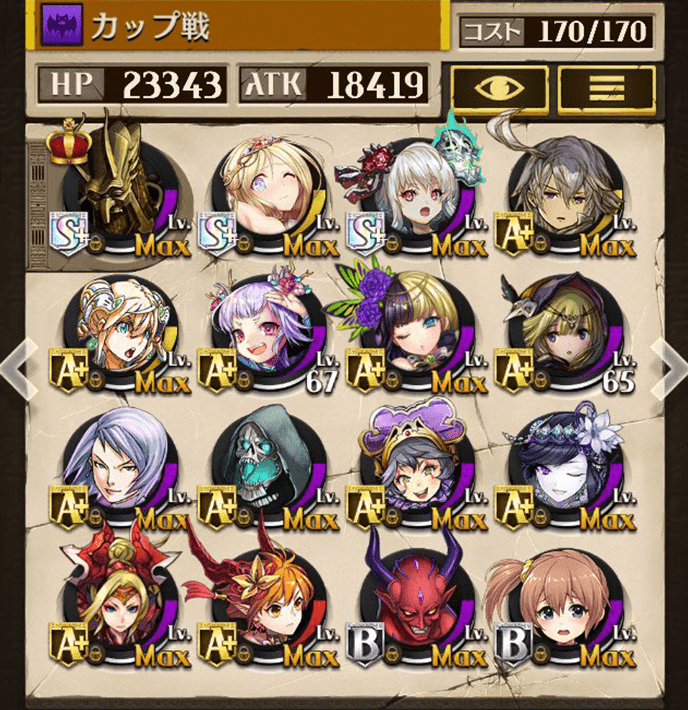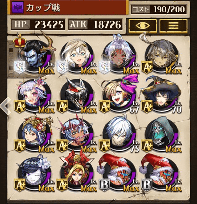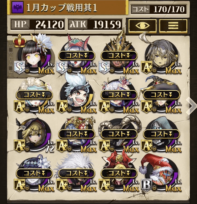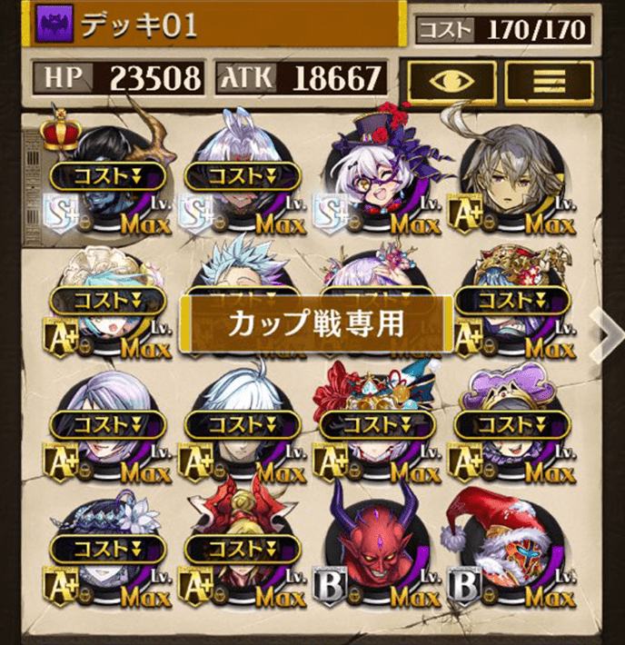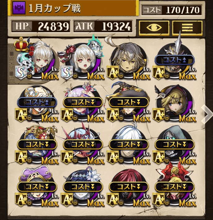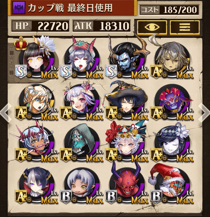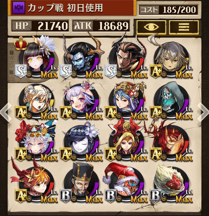 初日は、毒と罠を警戒していたので対策駒を投入。最終日は、呪い、デバフが目立ったので駒投げをし易くした。ごり押しができ巻き返し完了。早く闘化ブランジェッタをカップ戦で使いたいw