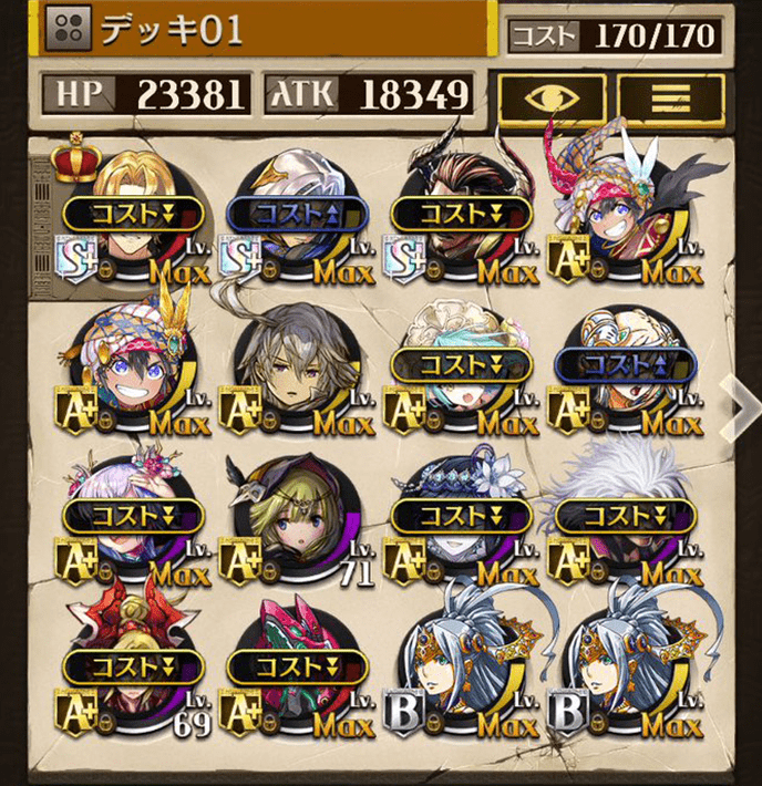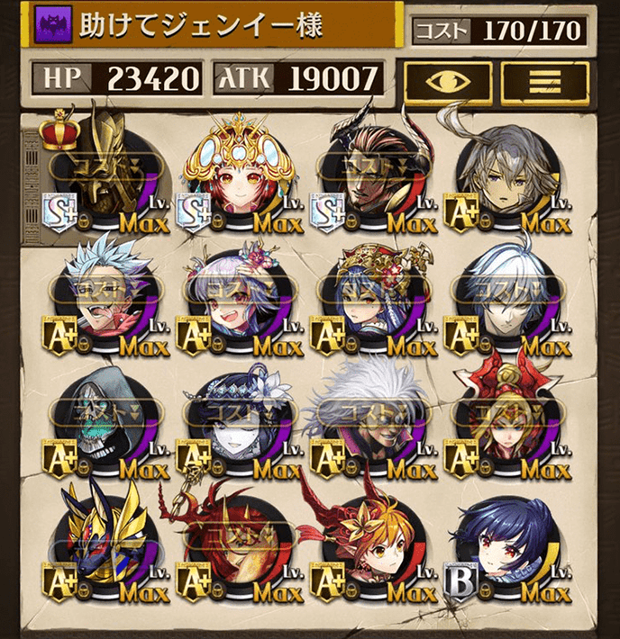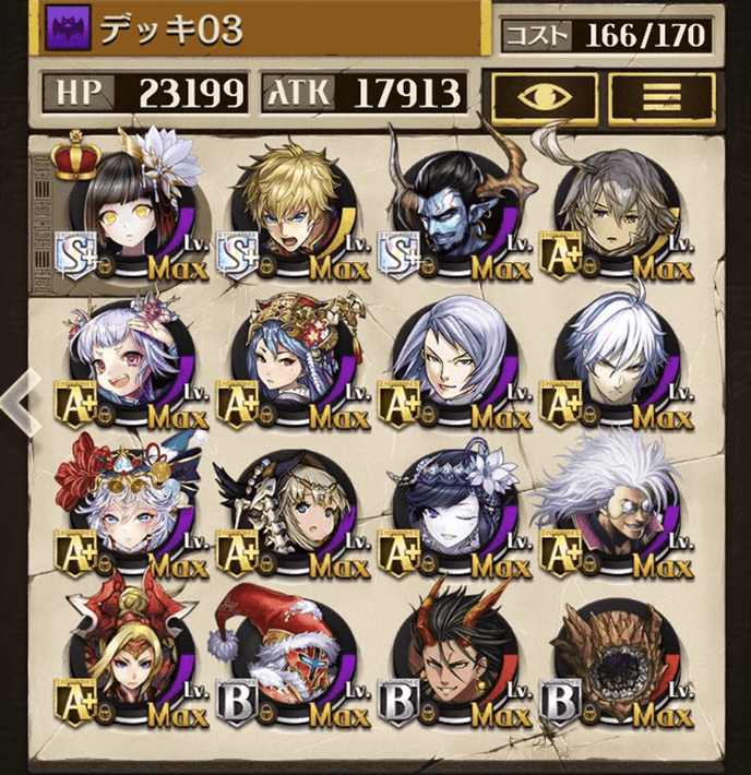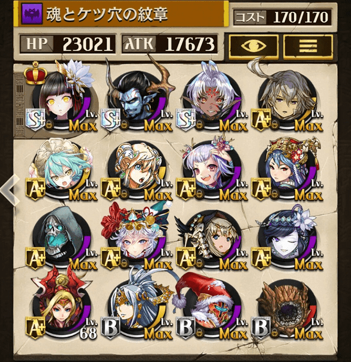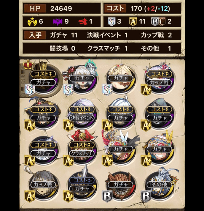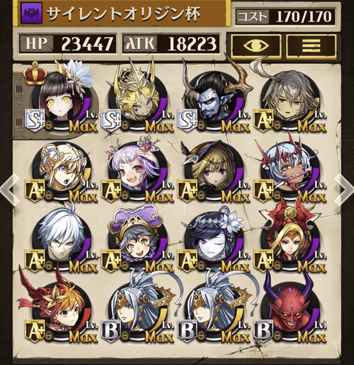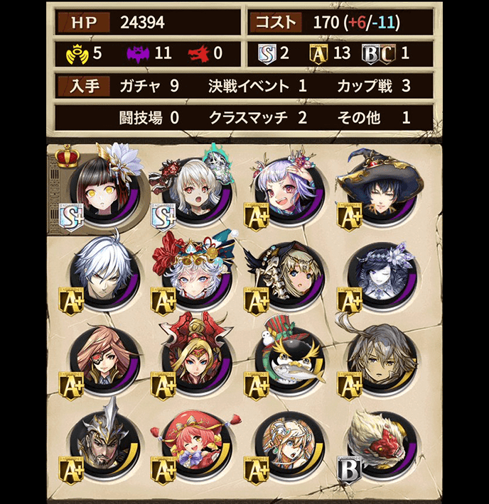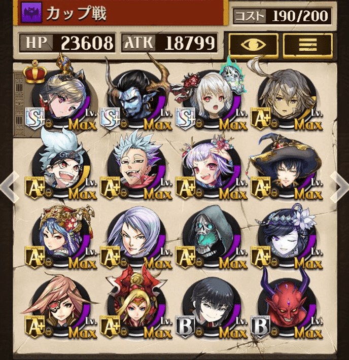 初日は、毒と罠を警戒していたので対策駒を投入。最終日は、呪い、デバフが目立ったので駒投げをし易くした。ごり押しができ巻き返し完了。早く闘化ブランジェッタをカップ戦で使いたいw