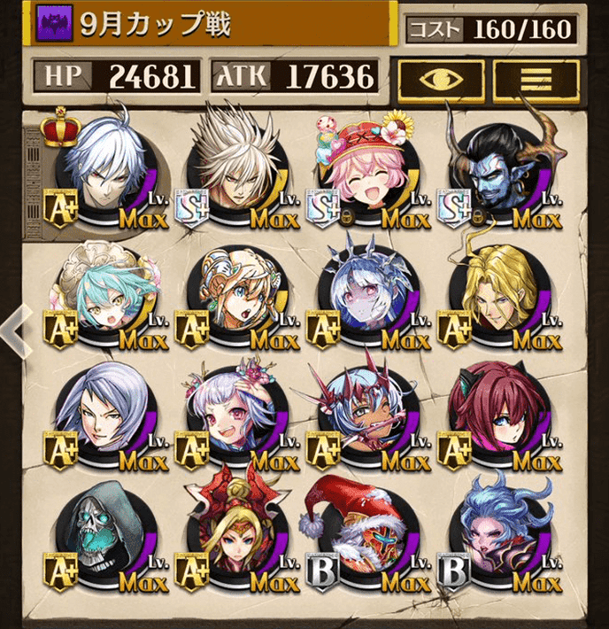 今回は魔属性に補正がかかっていたので初日はフルカストップで10連勝2日目に神単に4連敗をくらいその場で神単に変更ヴィクトリアとアラジンのWパンチで勝てる試合が多く連勝を積み重ねることができたカップ戦でした!