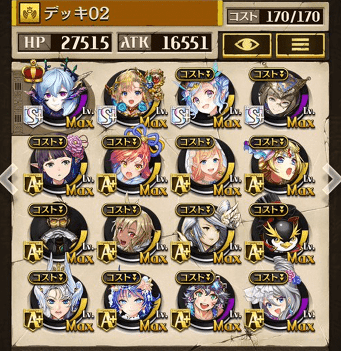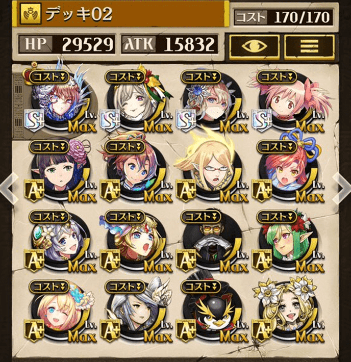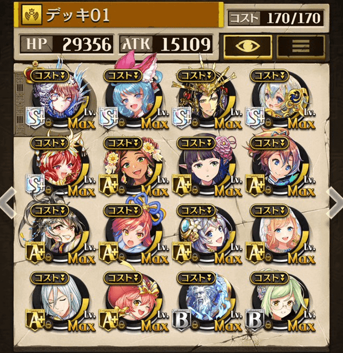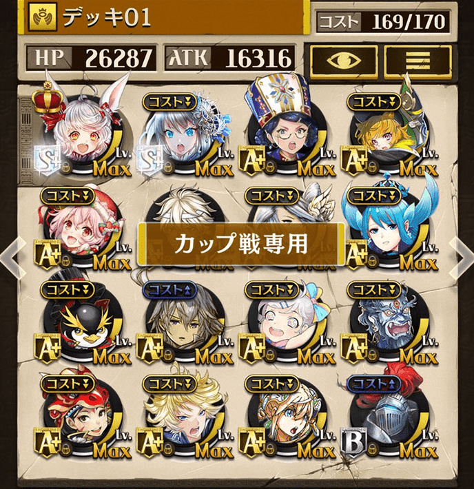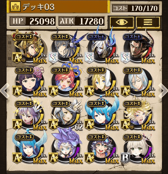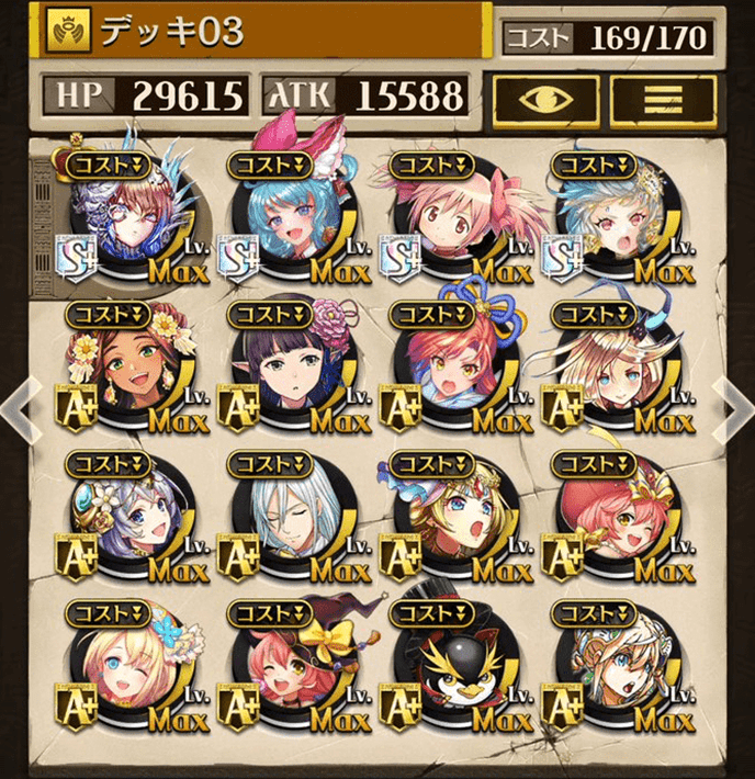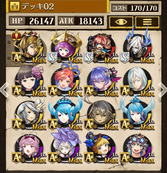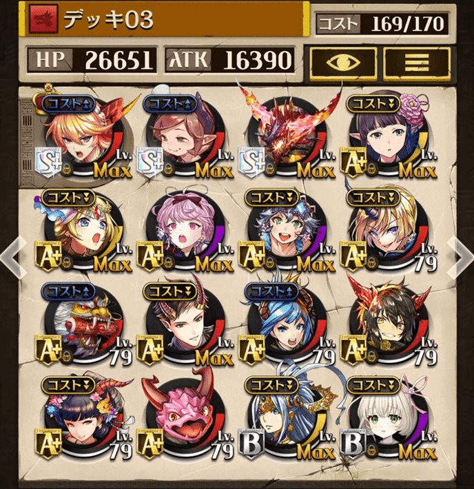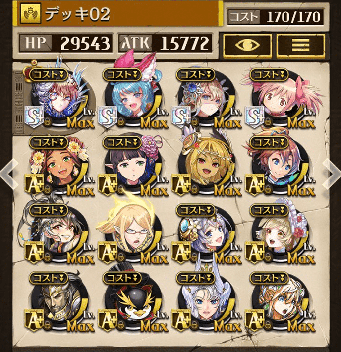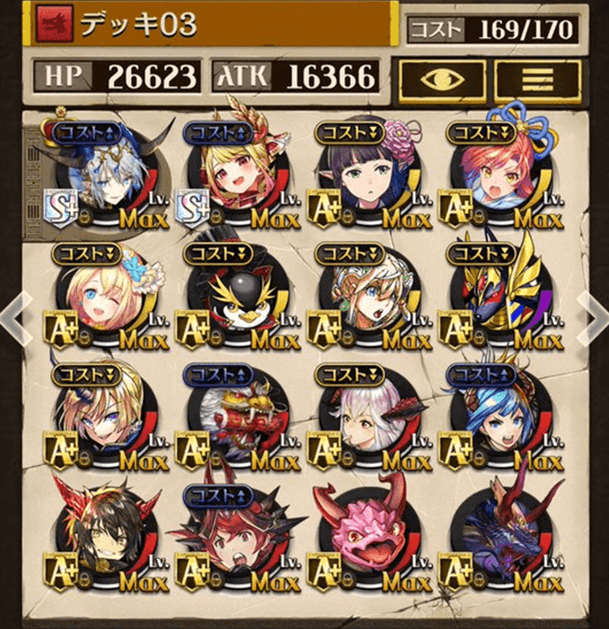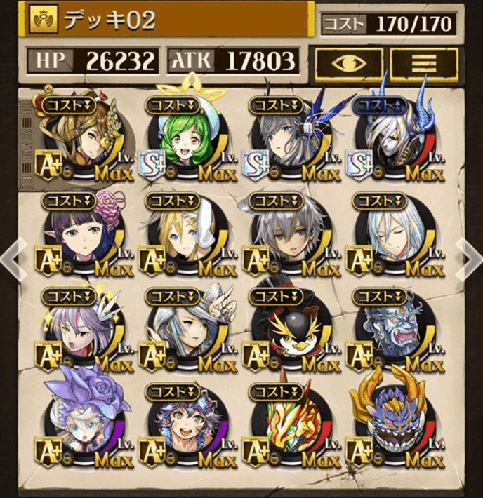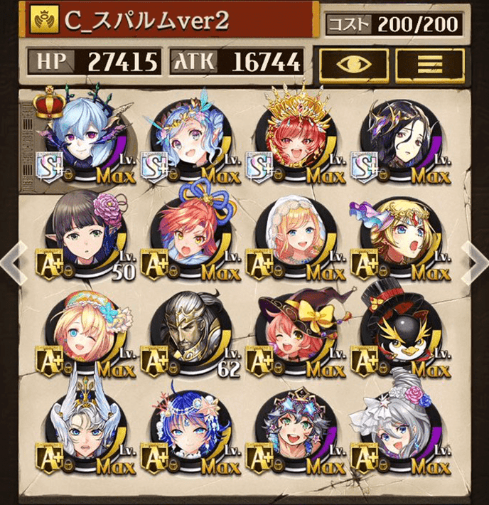 初?のスパルム耐久。特殊ダメ主体のデッキが多いと予想して闘化ヴィナと進化ティタを入れました。延命でオルプネーと回復A駒。回復A駒はコンボがダメージになってるのをなるべく選び、対ガブリエル対策でターン数のバランスを考えました。