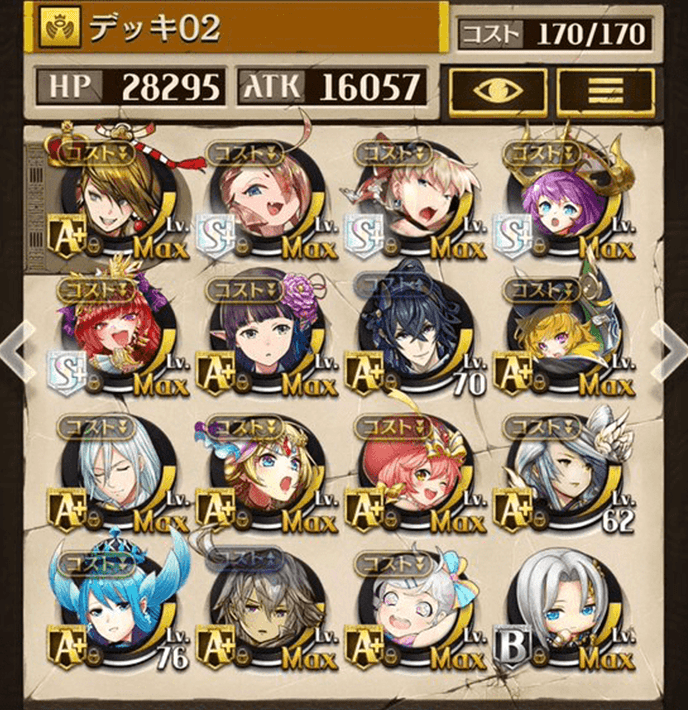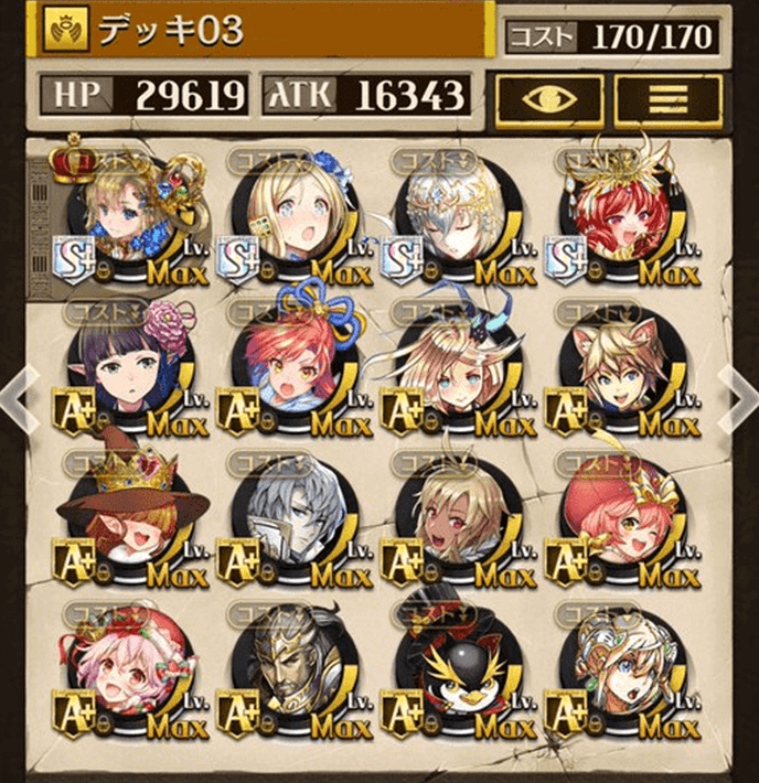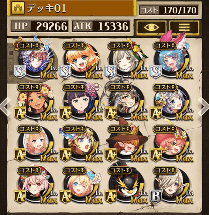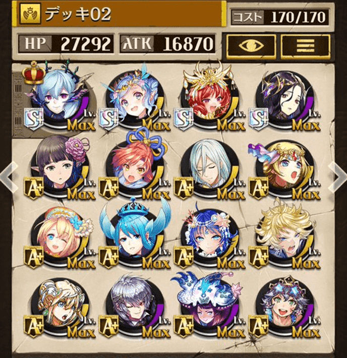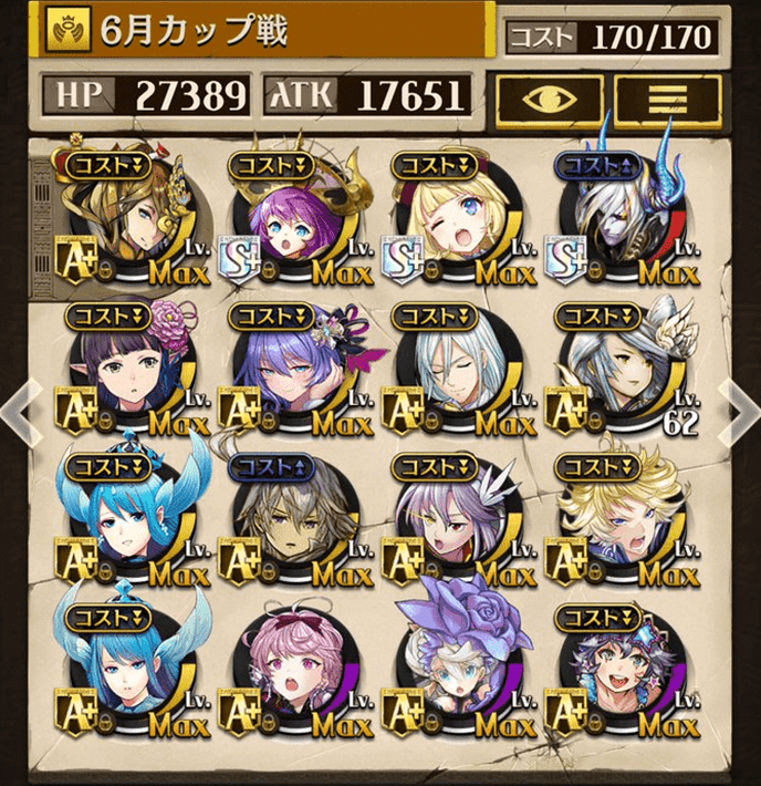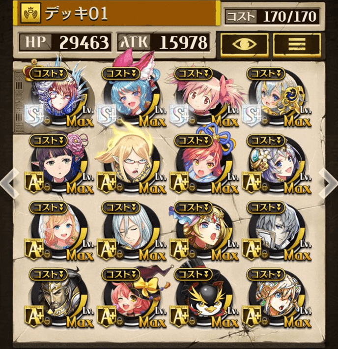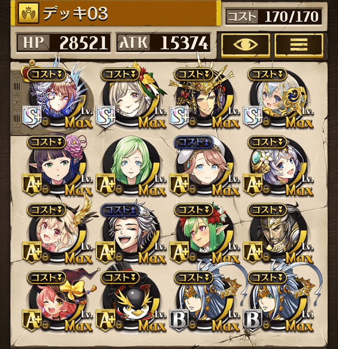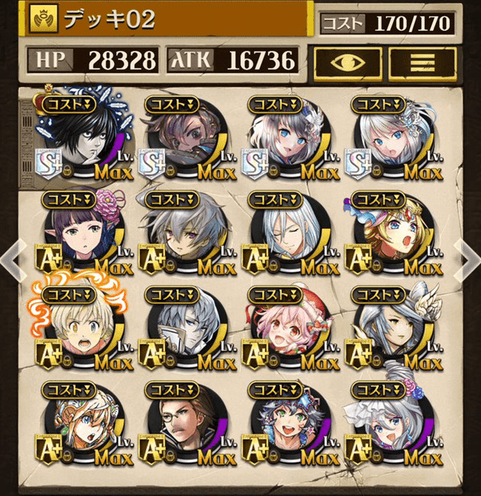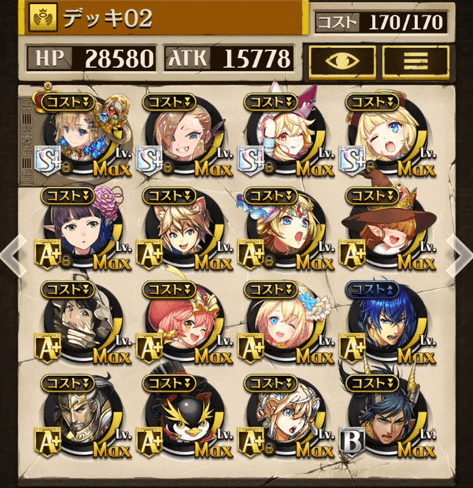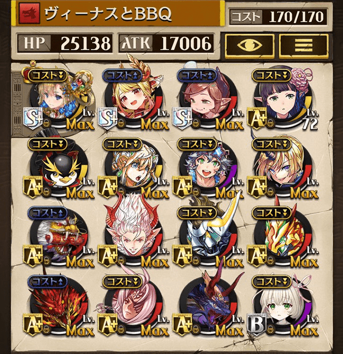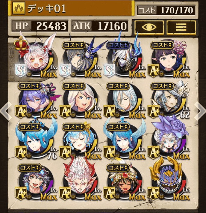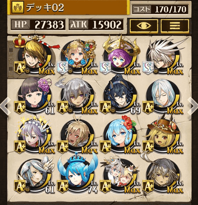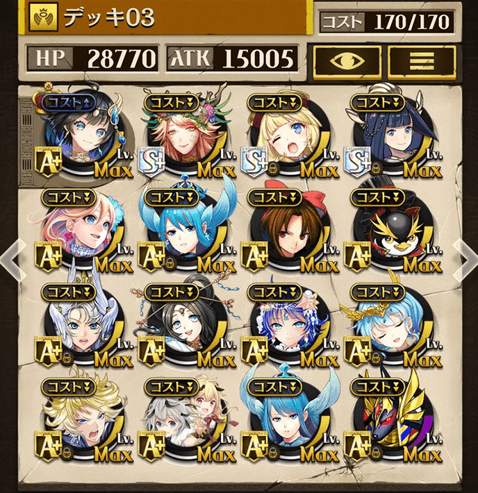 初?のスパルム耐久。特殊ダメ主体のデッキが多いと予想して闘化ヴィナと進化ティタを入れました。延命でオルプネーと回復A駒。回復A駒はコンボがダメージになってるのをなるべく選び、対ガブリエル対策でターン数のバランスを考えました。