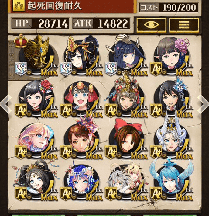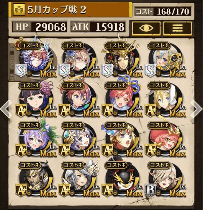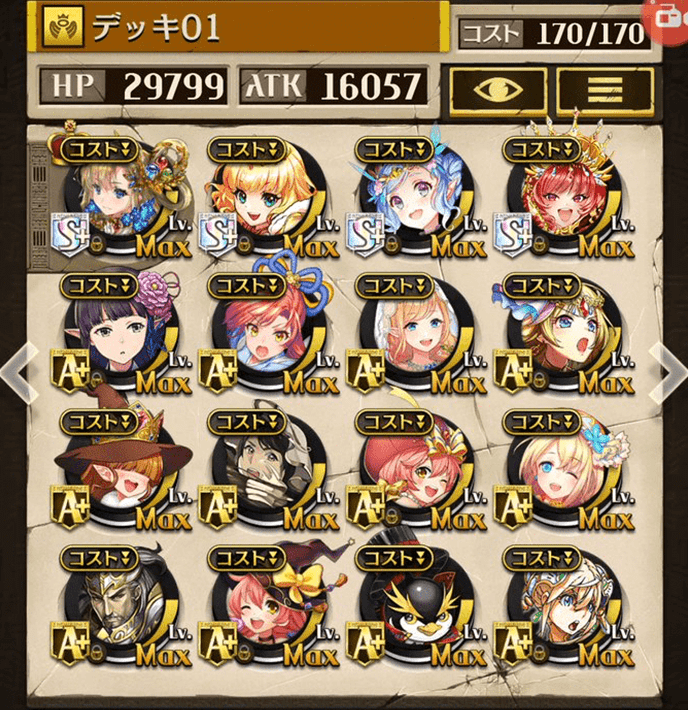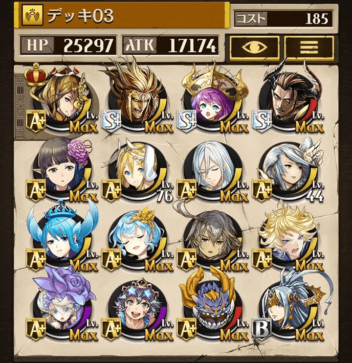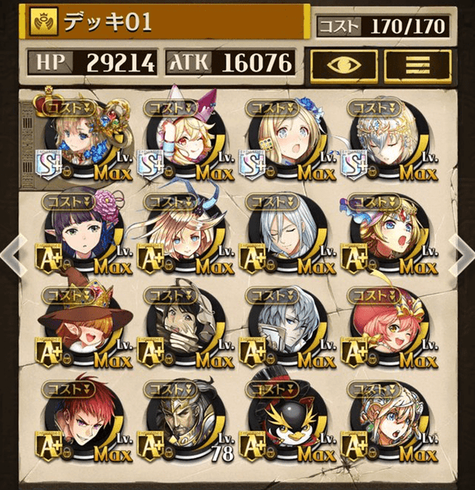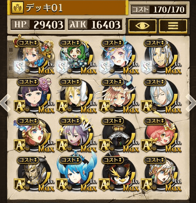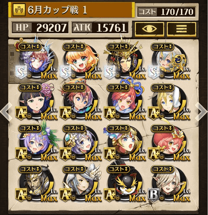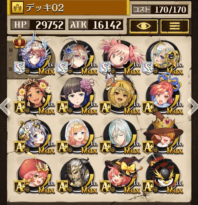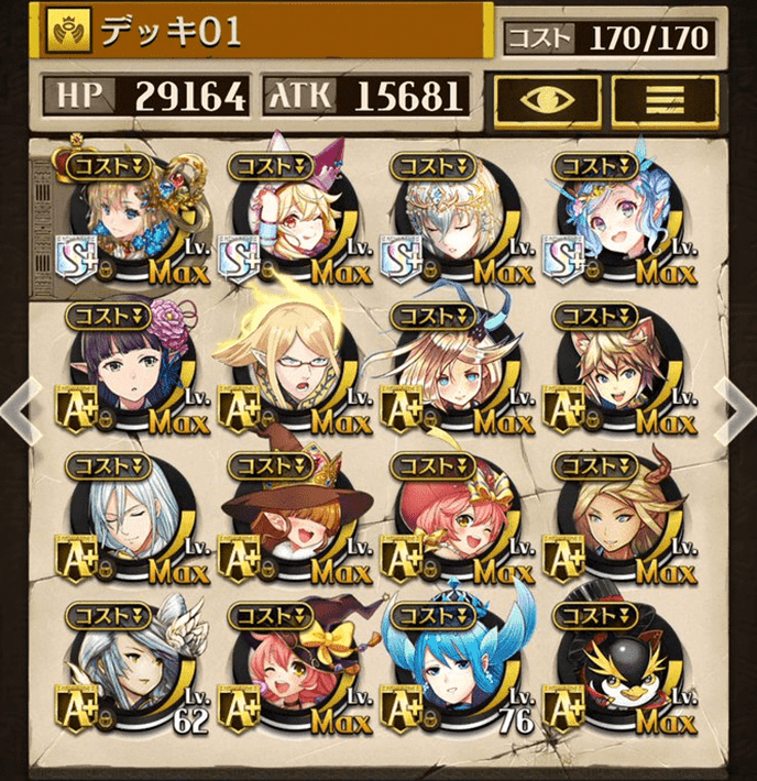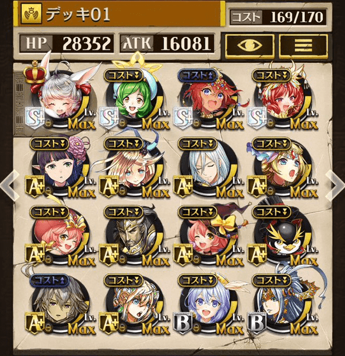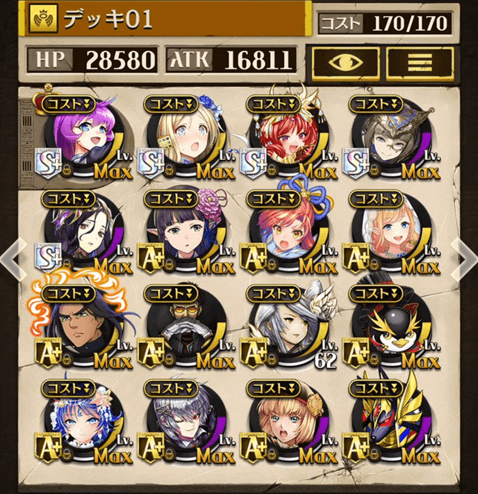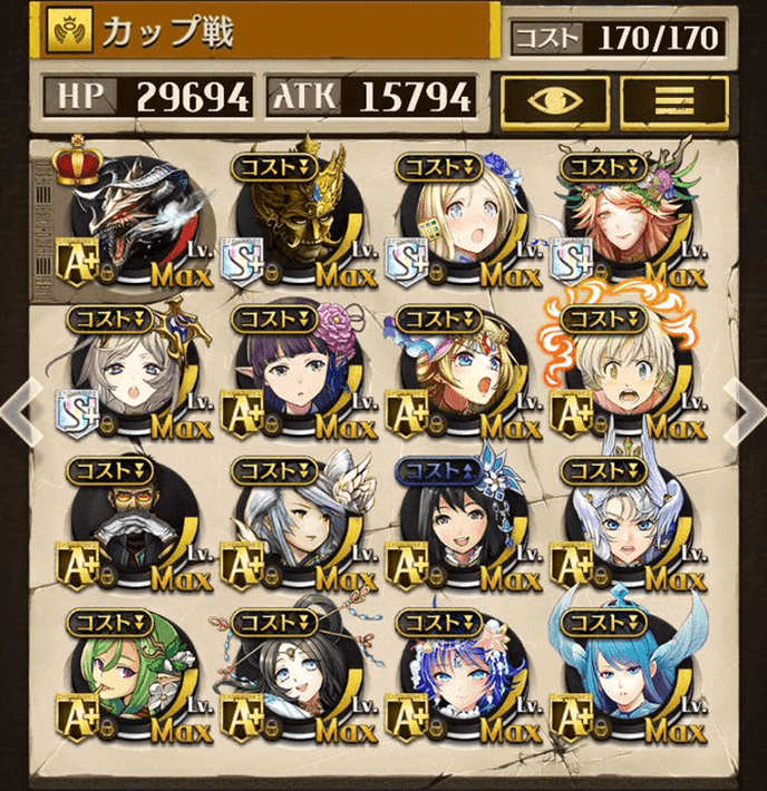 初?のスパルム耐久。特殊ダメ主体のデッキが多いと予想して闘化ヴィナと進化ティタを入れました。延命でオルプネーと回復A駒。回復A駒はコンボがダメージになってるのをなるべく選び、対ガブリエル対策でターン数のバランスを考えました。