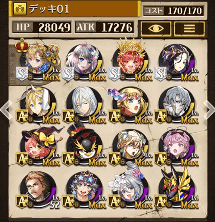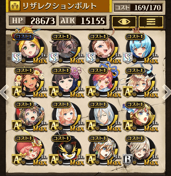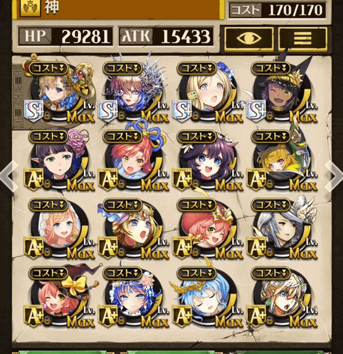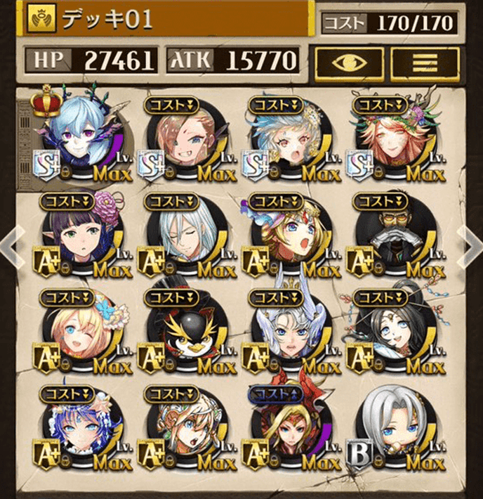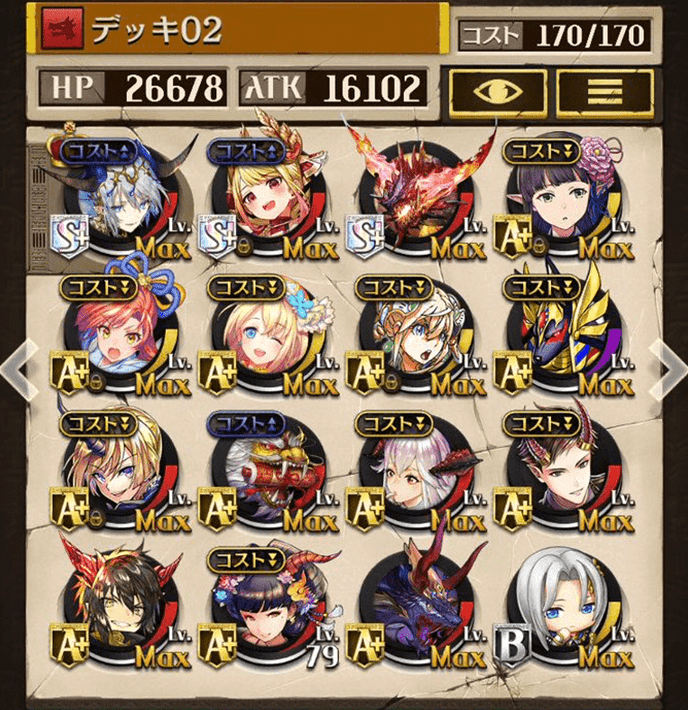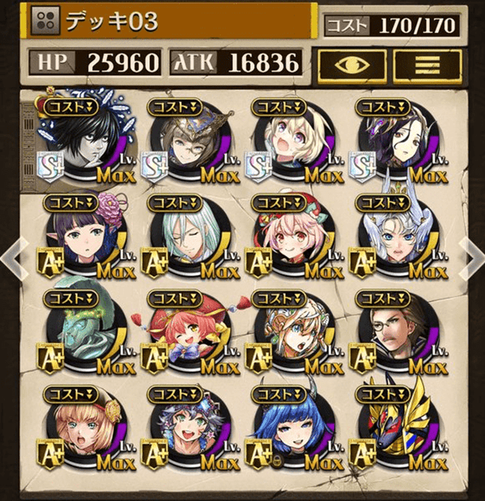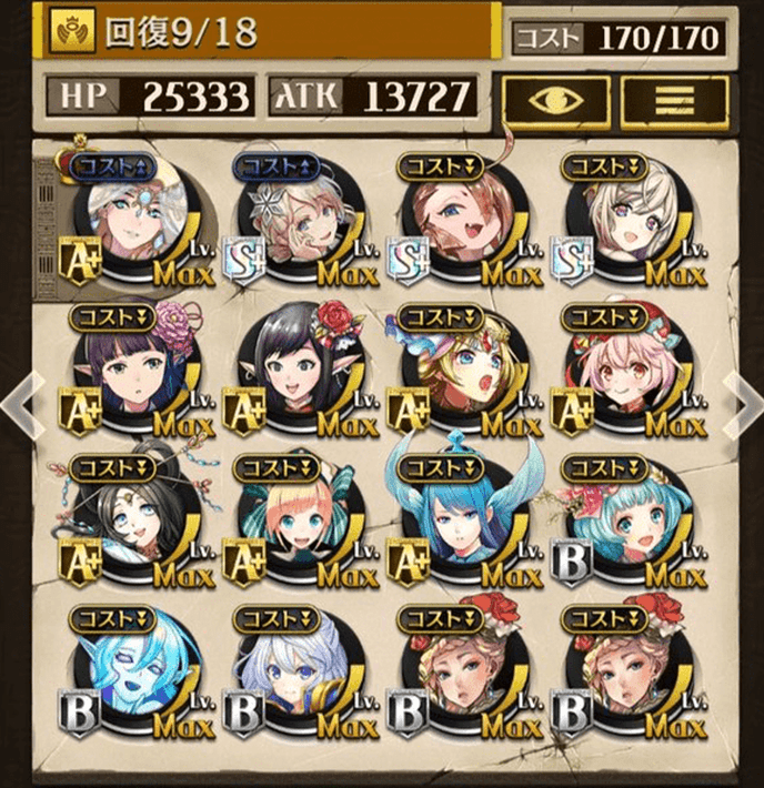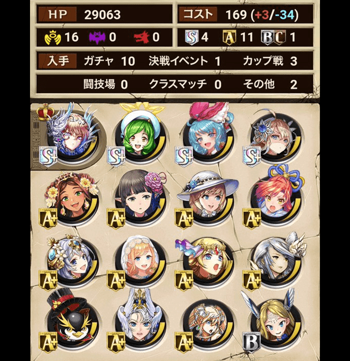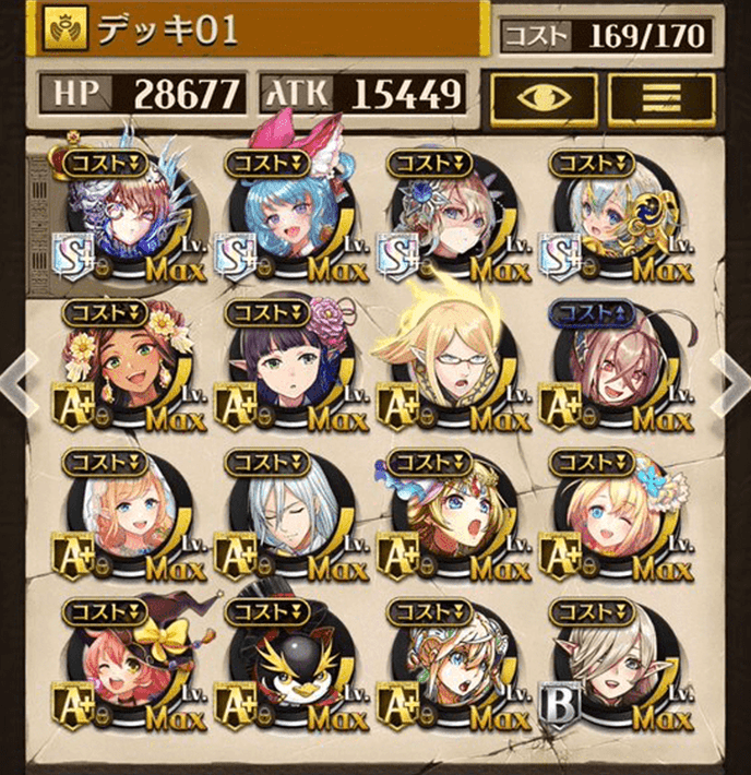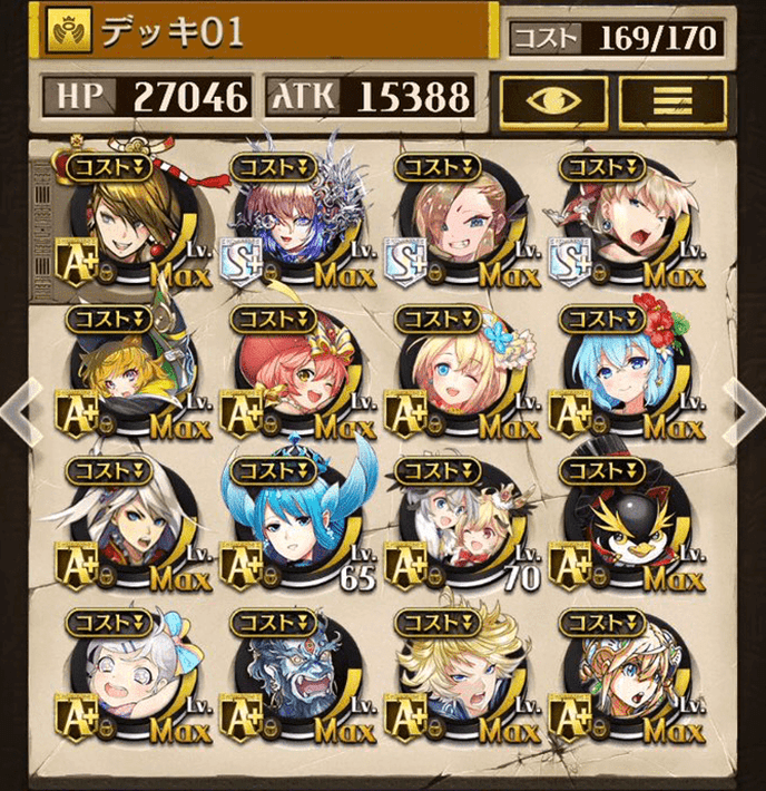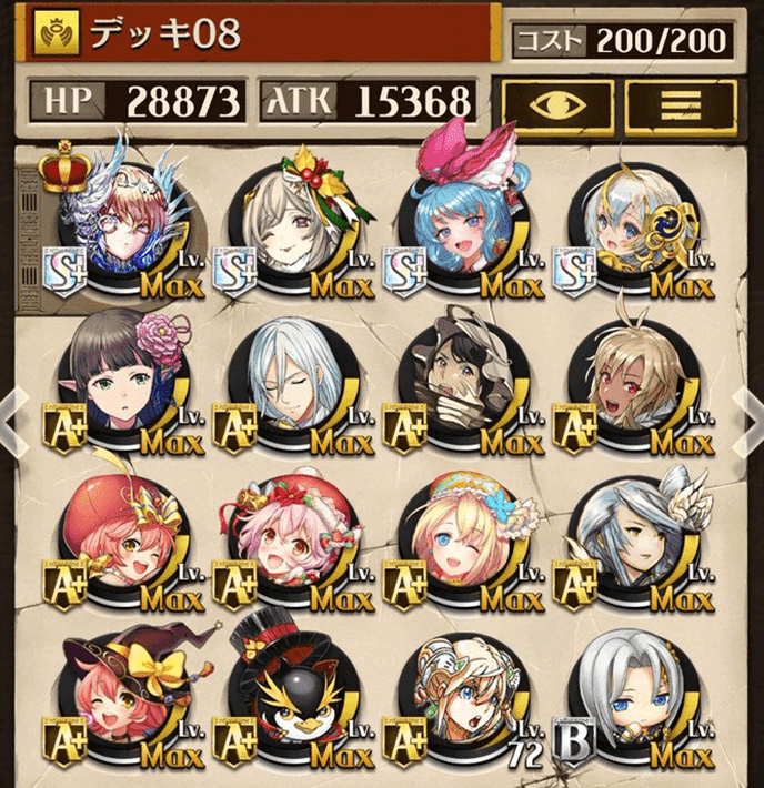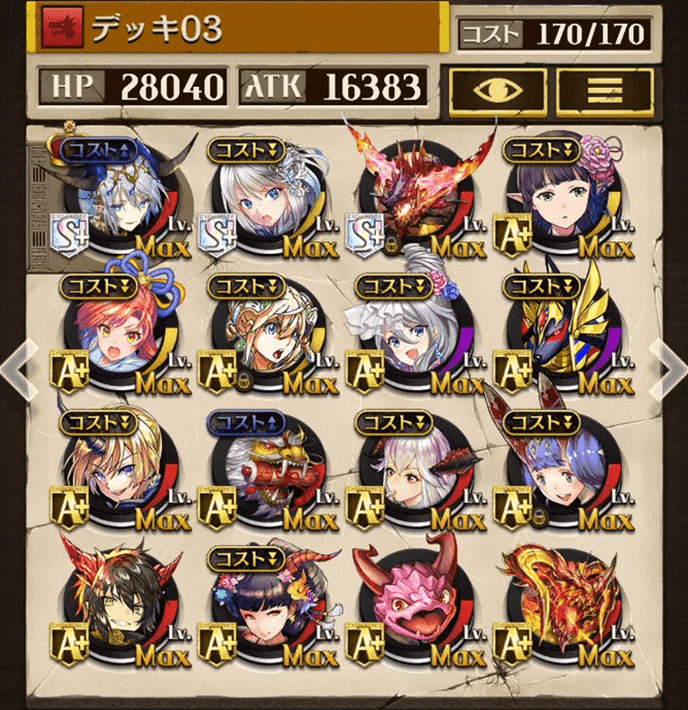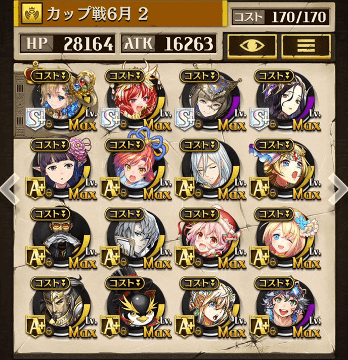 初?のスパルム耐久。特殊ダメ主体のデッキが多いと予想して闘化ヴィナと進化ティタを入れました。延命でオルプネーと回復A駒。回復A駒はコンボがダメージになってるのをなるべく選び、対ガブリエル対策でターン数のバランスを考えました。