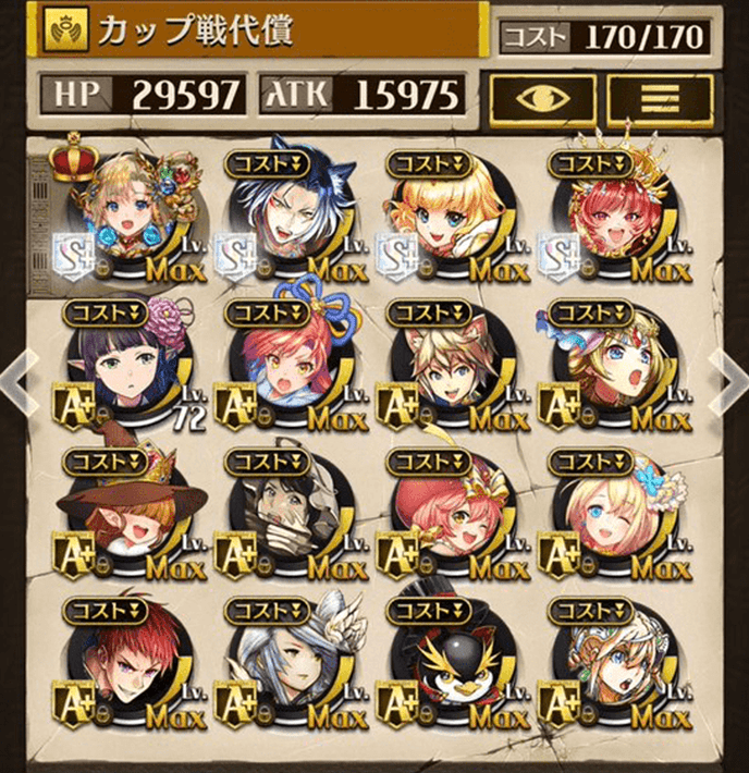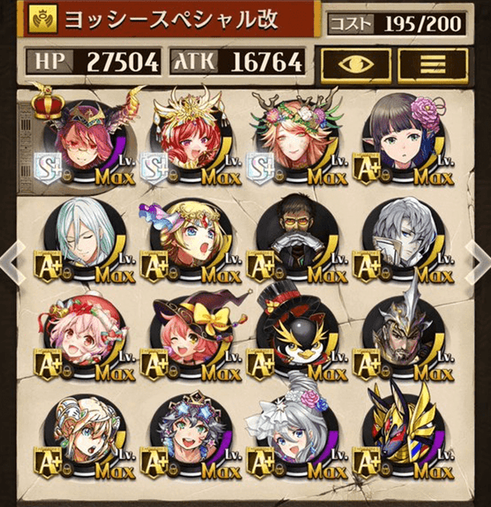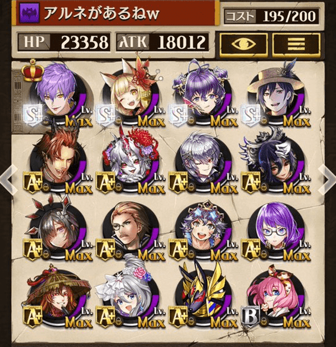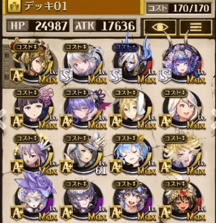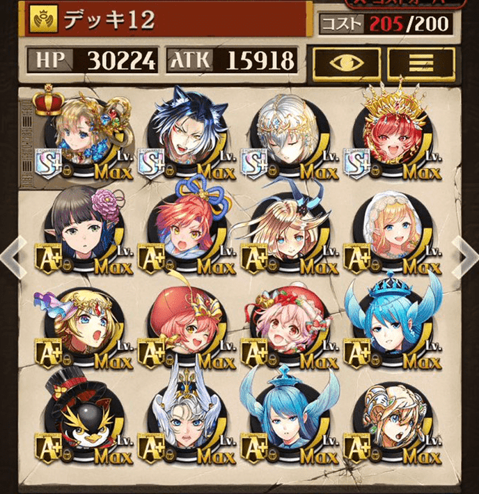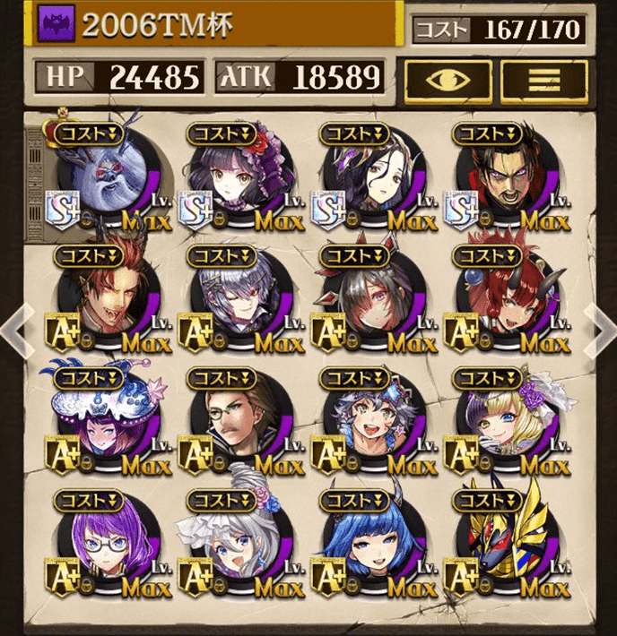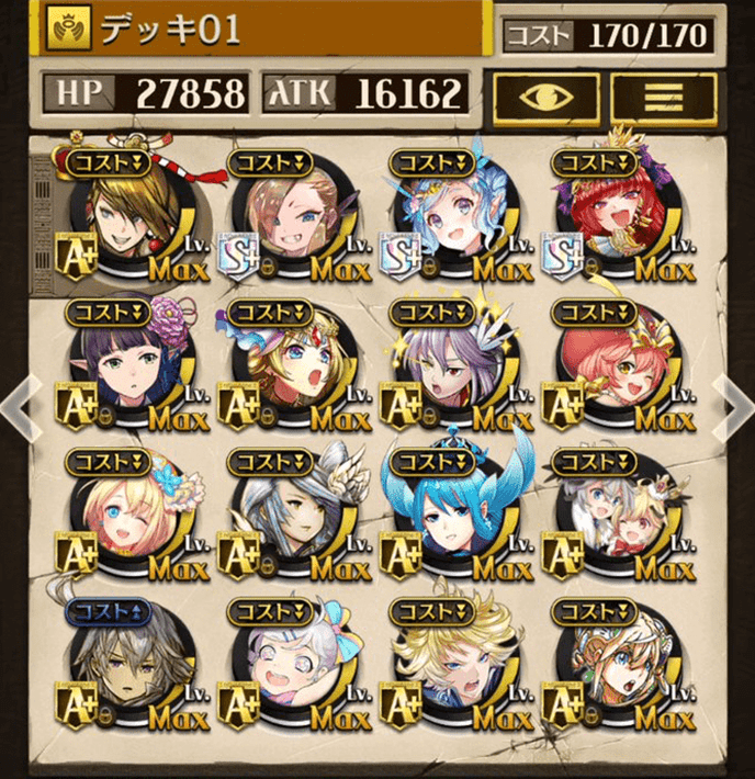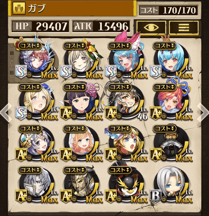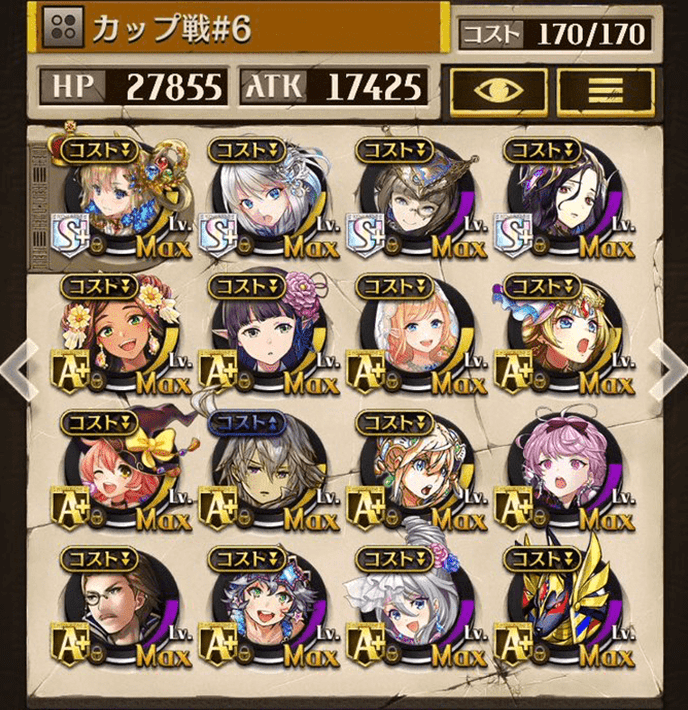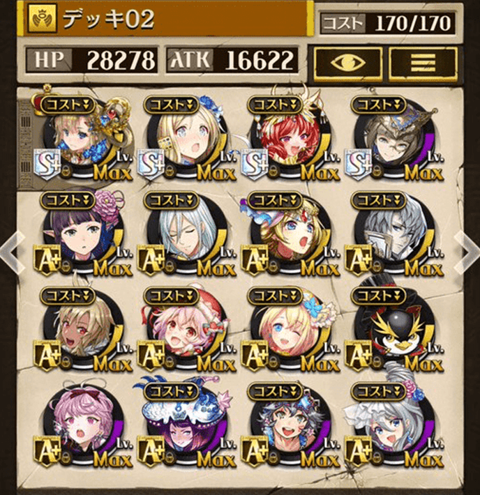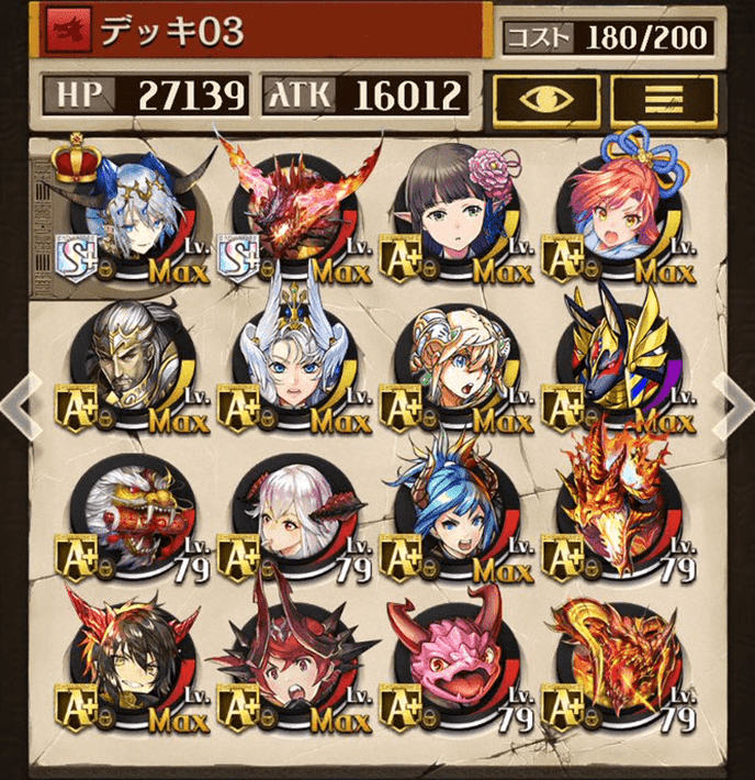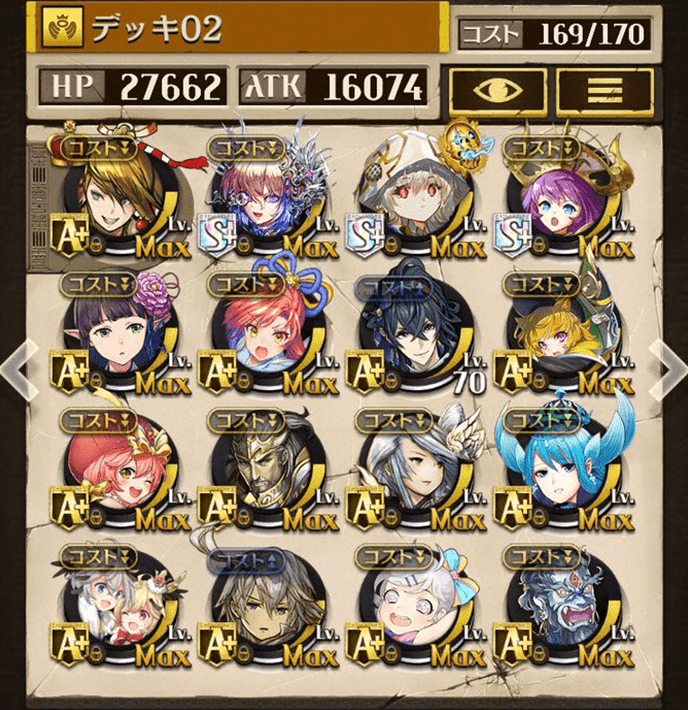 初?のスパルム耐久。特殊ダメ主体のデッキが多いと予想して闘化ヴィナと進化ティタを入れました。延命でオルプネーと回復A駒。回復A駒はコンボがダメージになってるのをなるべく選び、対ガブリエル対策でターン数のバランスを考えました。