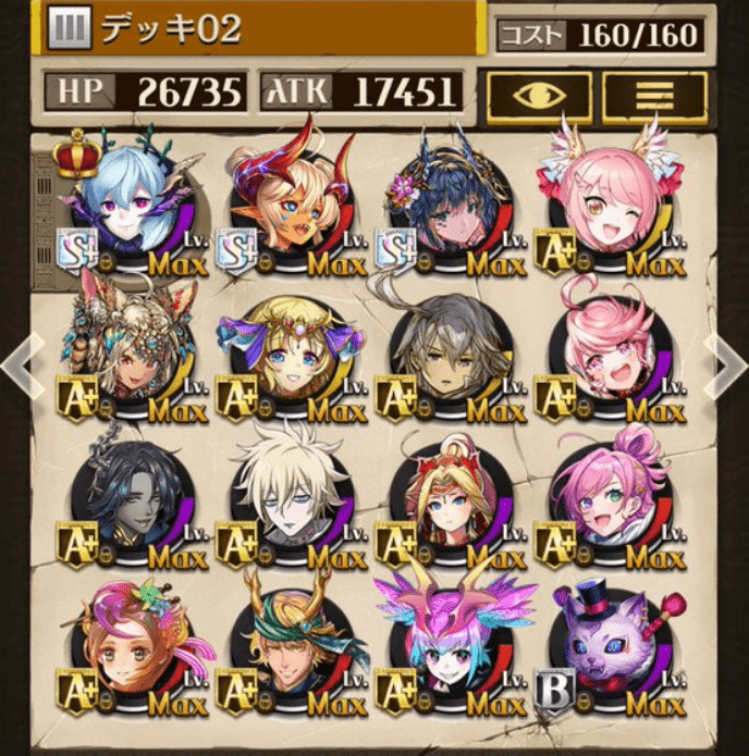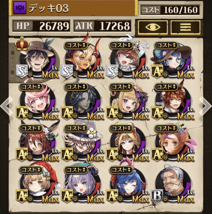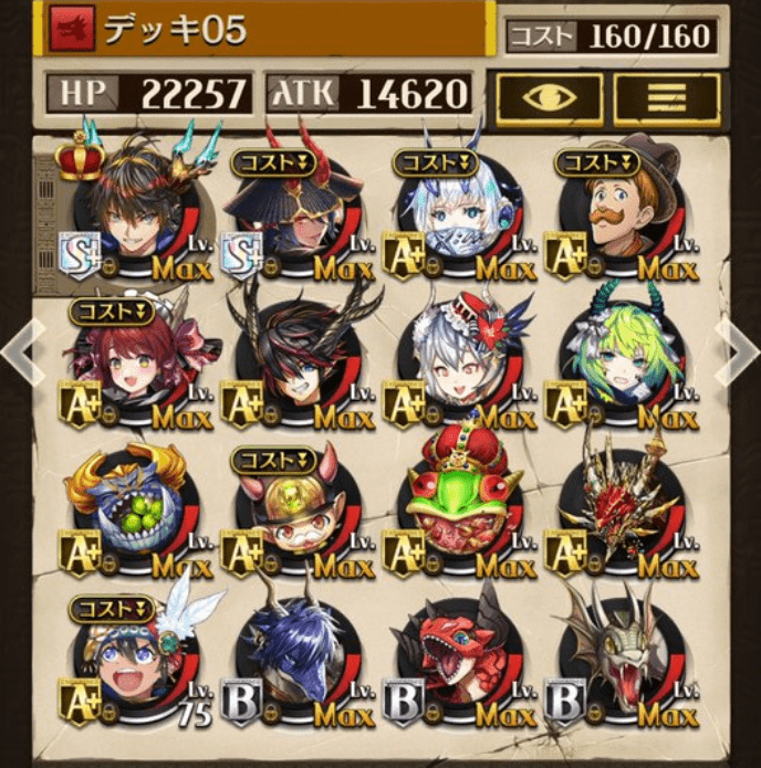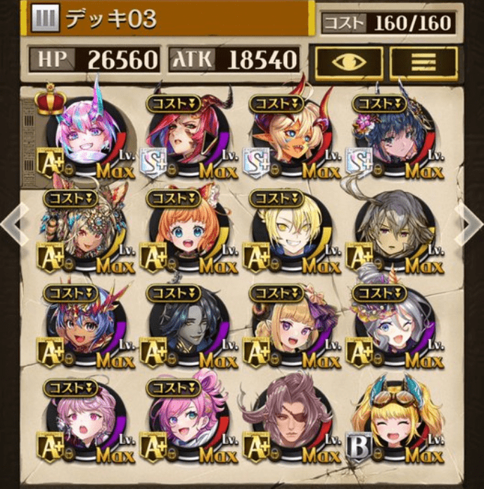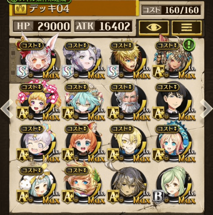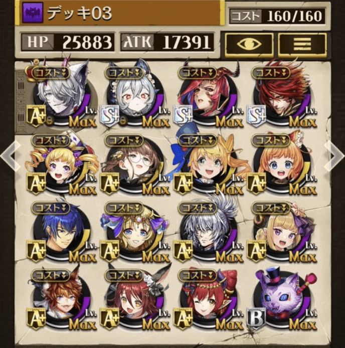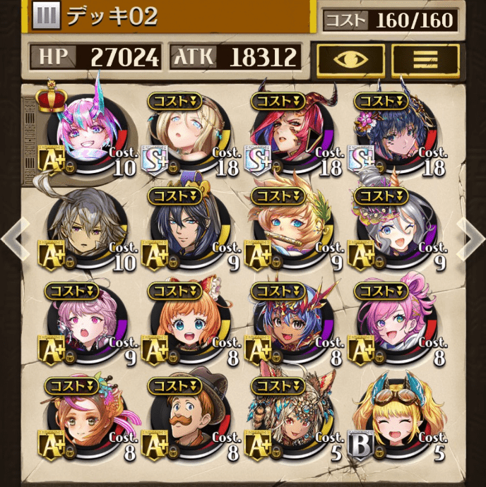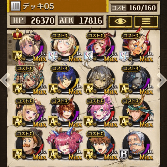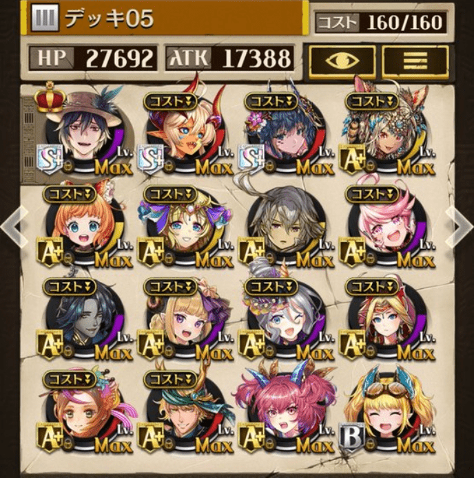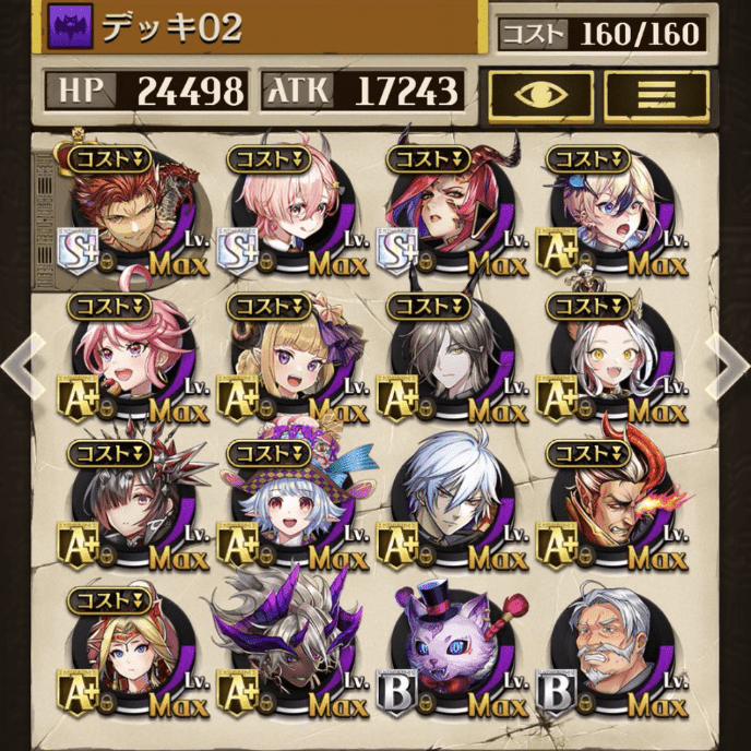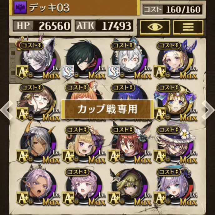 デッキ構築のコンセプトとしては、 強力なs3体は確定で、強いa駒のコスト8のキャラを持っていなかったので、コスト10のエンデガとファビオ、銀士郎を入れました。そうなると、b駒2体になりまずいので、前のカップ戦駒入れてHP底上げしました。手駒は割と出しやすい駒が多かったので、そこまで駒は腐らなかった印象です。真面目な文章なんですけど参考になれば嬉しいです。