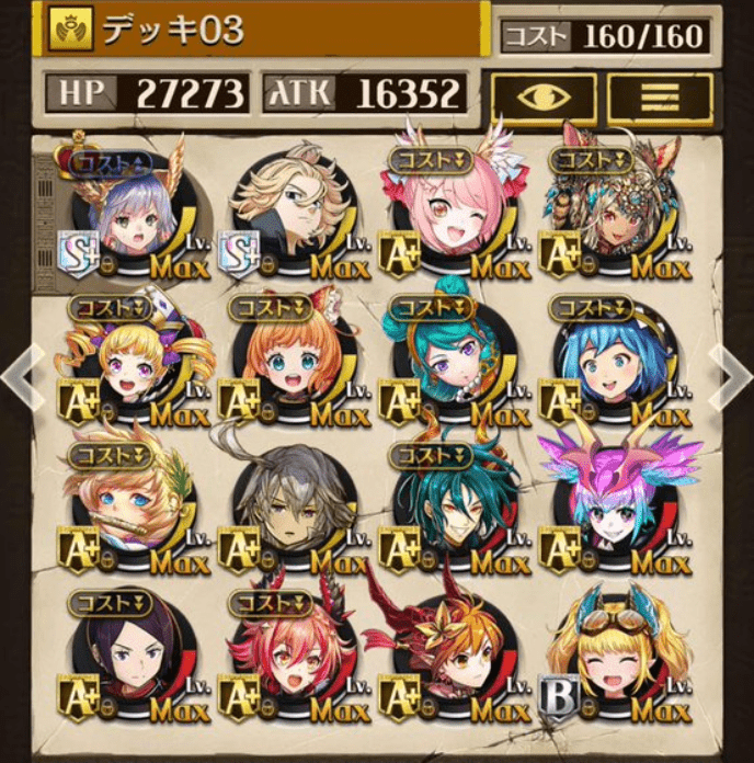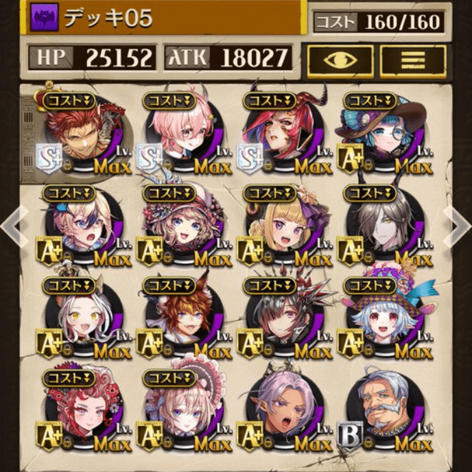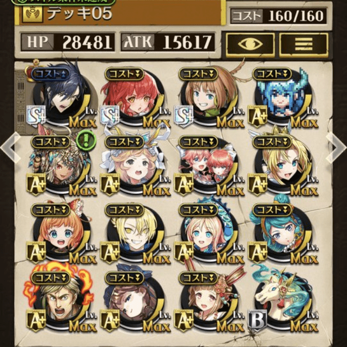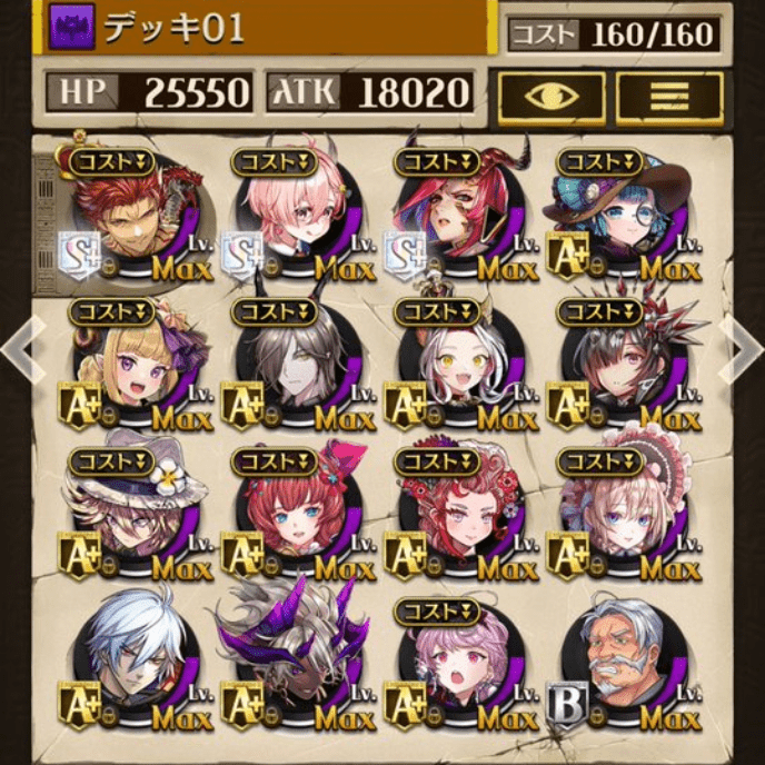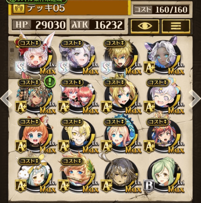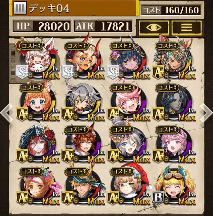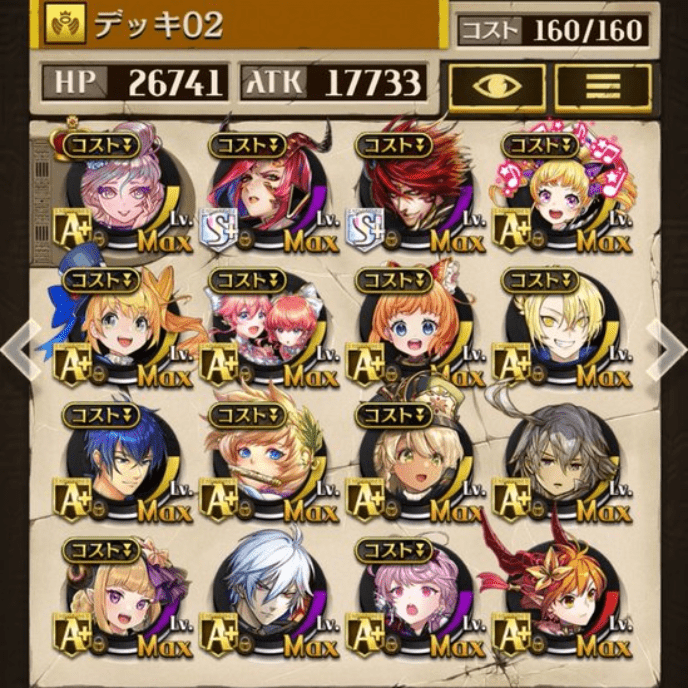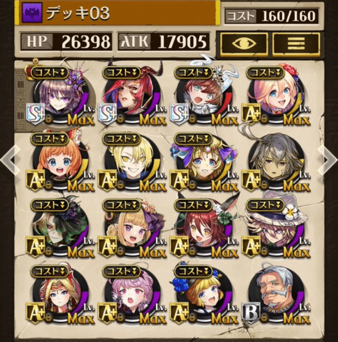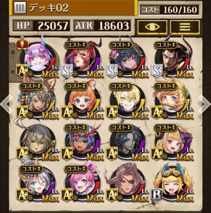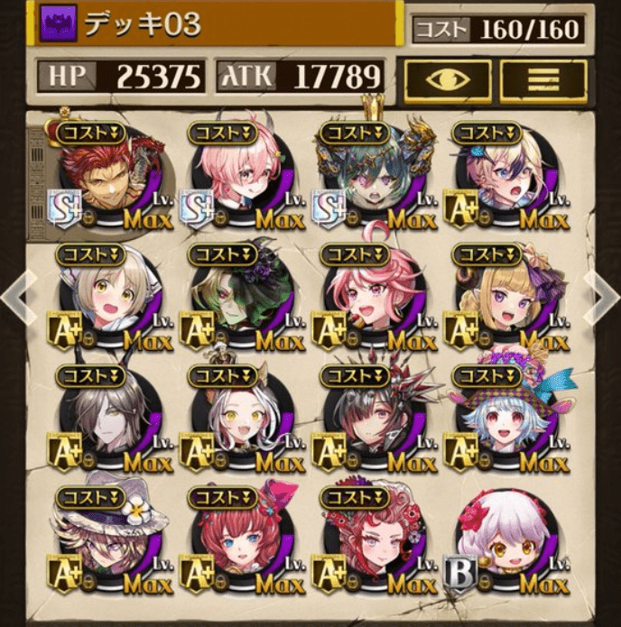 デッキ構築のコンセプトとしては、 強力なs3体は確定で、強いa駒のコスト8のキャラを持っていなかったので、コスト10のエンデガとファビオ、銀士郎を入れました。そうなると、b駒2体になりまずいので、前のカップ戦駒入れてHP底上げしました。手駒は割と出しやすい駒が多かったので、そこまで駒は腐らなかった印象です。真面目な文章なんですけど参考になれば嬉しいです。