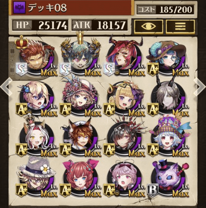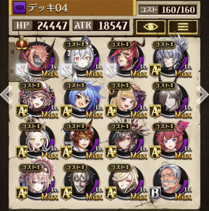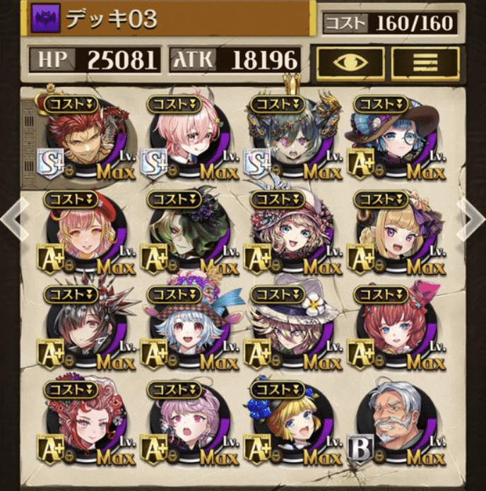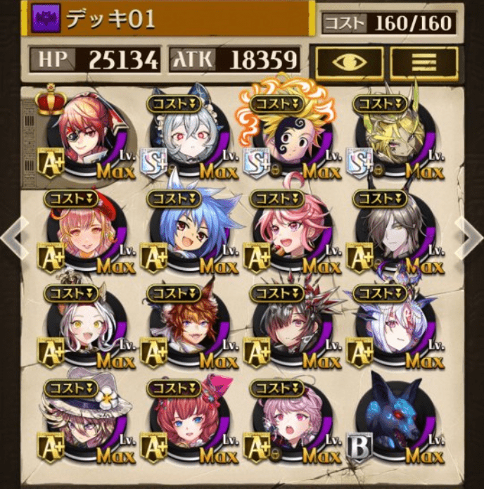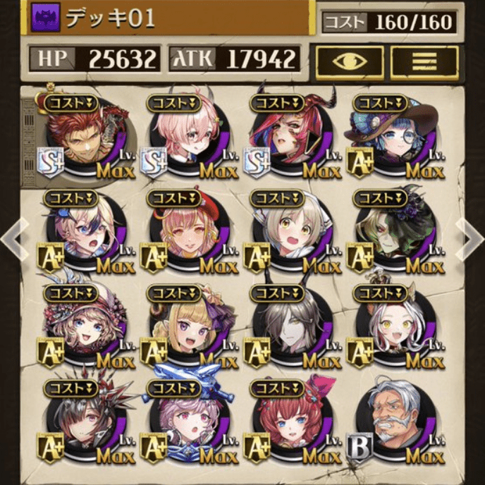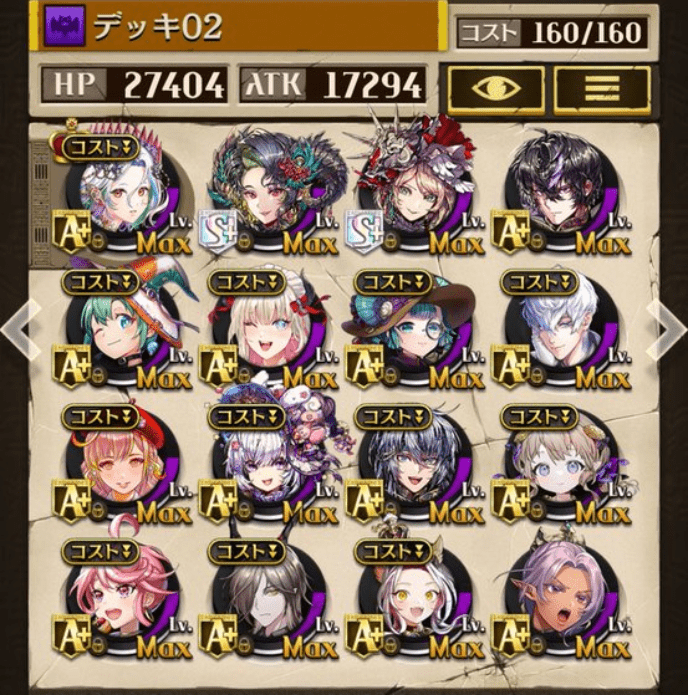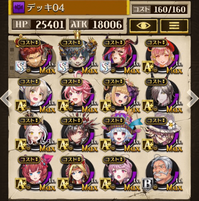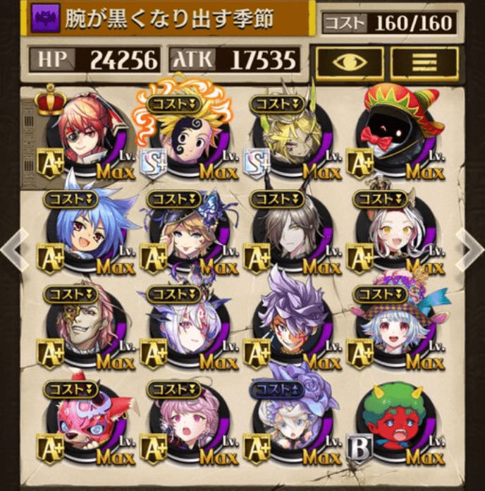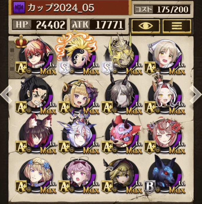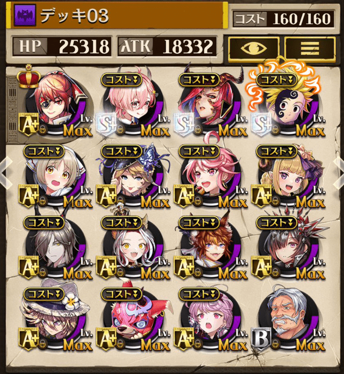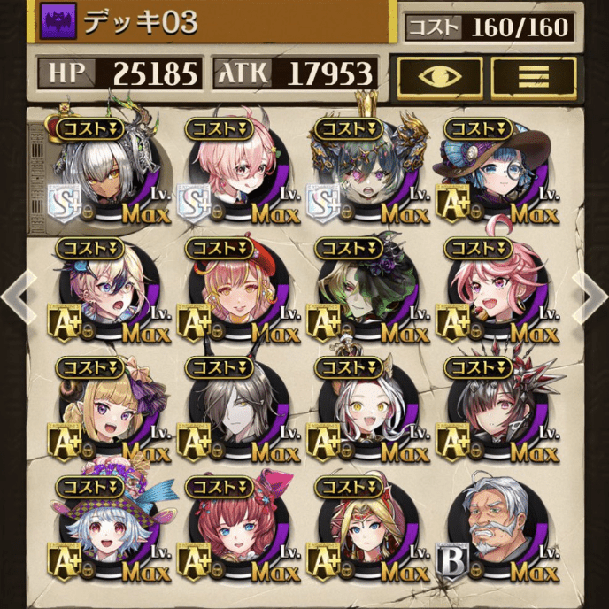 デッキ構築のコンセプトとしては、 強力なs3体は確定で、強いa駒のコスト8のキャラを持っていなかったので、コスト10のエンデガとファビオ、銀士郎を入れました。そうなると、b駒2体になりまずいので、前のカップ戦駒入れてHP底上げしました。手駒は割と出しやすい駒が多かったので、そこまで駒は腐らなかった印象です。真面目な文章なんですけど参考になれば嬉しいです。