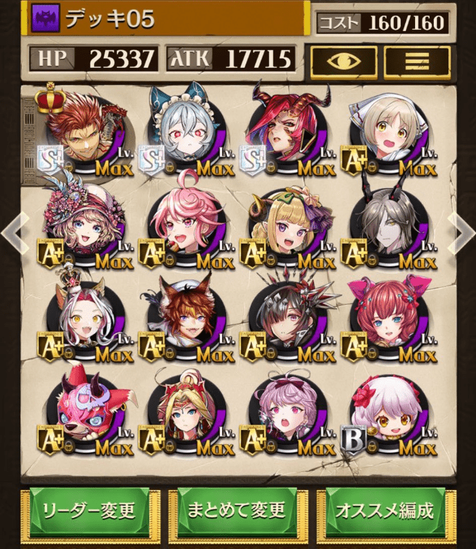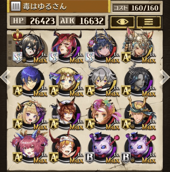 序盤や中盤は閻魔やガガ等の回復でHPを保ちつつ、終盤毒の火力が上がるタイミングでアンデッドを使いました。扱いが難しいデッキでしたが良かったです。 ドルチェやクルト、メリオダス、メドゥーサほしいな…