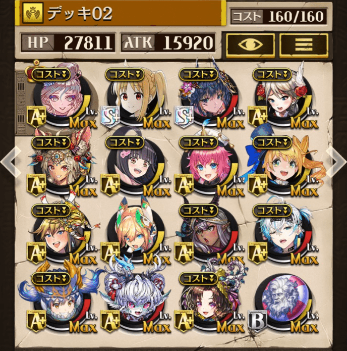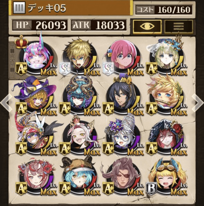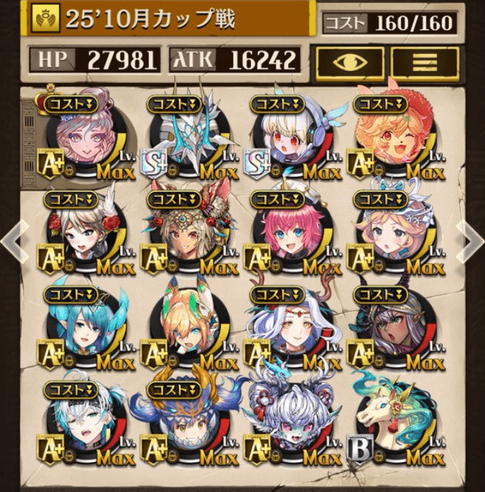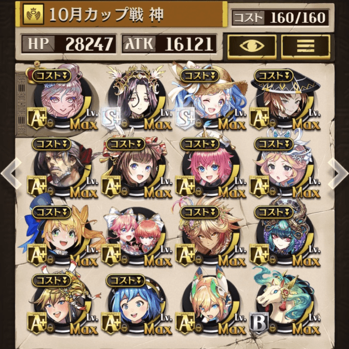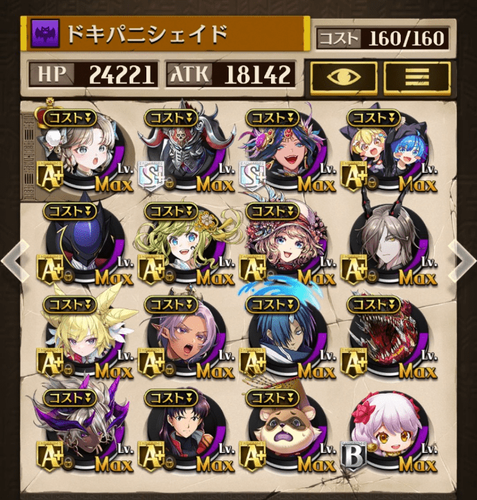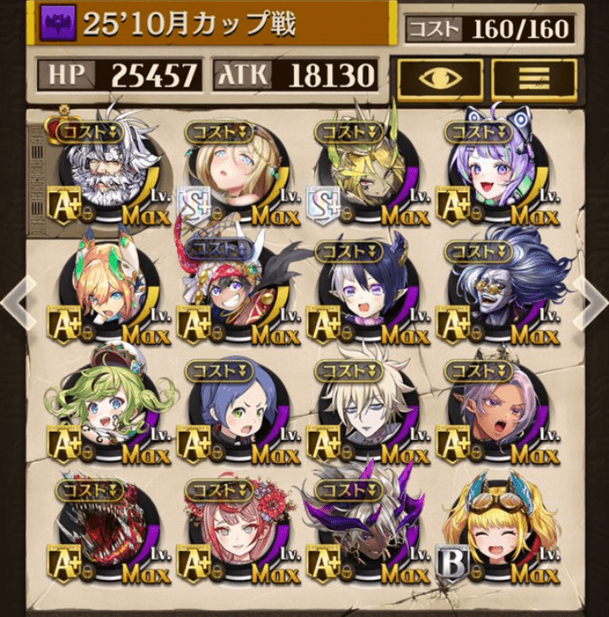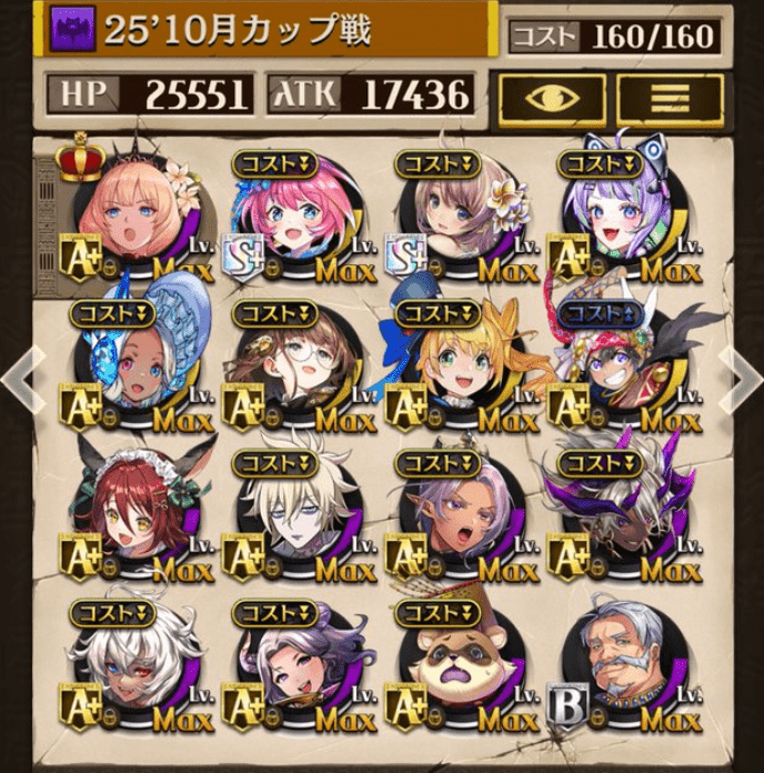 サブオーラを採用しない代わりにバフ駒を多めにしました。滑り込みでゲットしたパメラが強かった!今でも変わらず強いジークと、東リベコラボ3人に感謝です😌💕