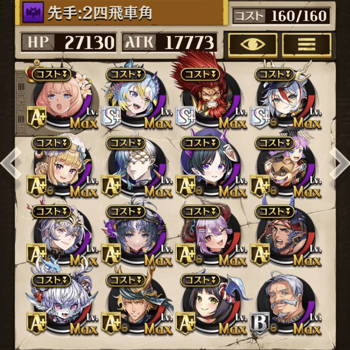 B駒無しでHPを高めに設定しました! S駒が優秀で回復があるので、立ち回りを意識しました。ほぼミスなく上手く打てました😊 あと、最速ルルカは最強です👊